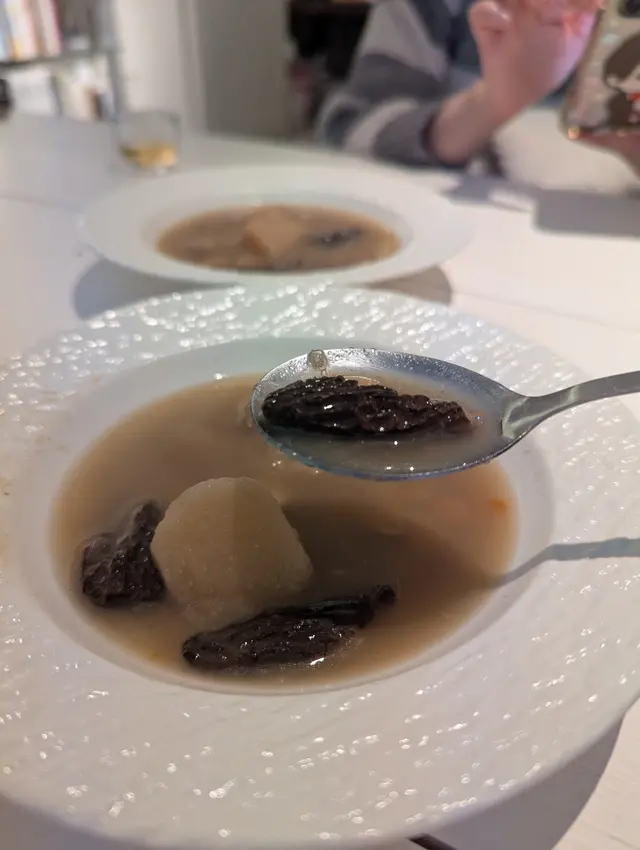 素某 so’N 的素食不只給人一種健康的感覺,也能是一種美學。之前有吃過午餐且覺得不錯,這次特地再訪,來試試它的「素某晚宴」。依舊是簡約舒適的空間,但隨著夜幕低垂,夜晚的柔光讓空間氛圍變得更沈靜。而且在這裡能感受到那份「慢」的節奏,體會「食」與「心」之間的平衡。素某晚宴 (HKD 298/一人前) 首先會有席前小食和素菜沙律。小食有秋葵、牛蒡與蟲草花,浸在清爽的醬汁中。三款口感很有對比,而且味道輕盈得來很有層次,恰好開啟味蕾。素菜沙律除了沙律菜,還有葡萄柚絲與櫻桃番茄,加上微甜的醋很開胃。是日湯品是香氣撲鼻的牛肝菌湯,味道非常濃郁,入口時能感受到厚實的菌香。喝起來層次感相當飽滿,亦很順滑細緻。另外還有炸得香脆的野菜天婦羅。會有南瓜、番薯、香菇和茄子,可以依個人喜好蘸淮鹽來提味。主食選了 燒大啡菇.溫野菜.山藥慕絲。擺盤頗吸引,配上可食用花點綴,讓整體看起來相當精緻。多汁有彈性的大啡菇,內裡是菠菜和芝士。底層的山藥慕絲很綿滑,沒有太多黏稠感。山藥有種自然的甘甜味,若覺得不夠味,我覺得能搭配附上的青花椒油來吃。另外,一旁的溫野菜則以多款菇類和露筍為主,炒得幾惹味。昆抹茶蕎麥冷麵.自家製炸餃子 綠色蕎麥麵配上鮮色的素魚生切片,視覺上色彩對比鮮明。蕎麥麵帶有淡淡的抹茶香氣﹐而且幾有彈性。配上清爽微鹹的湯底,整體不錯。自家製炸餃子與冷麵是一冷一熱的搭配,餃子外層炸得很金黃香脆。內餡是滿滿的蔬菜與菇類,相對冷麵來說也是濃味一點。可以加錢選擇分成四季主題的甜品,這次選了當季的 麗楓秋栗 (+HKD 28),以及 精選素蛋糕 (+HKD 28)。番薯帶著薄脆的焦糖層,甜香中帶微微焦香,入口綿密。搭配香濃的栗子蓉和底層的穀物脆片,口感非常豐富且是很有秋意的甜品。蛋糕面層有甜度適中的青提子,吃起來整體很輕盈。晚宴會包一杯 特選拼配茶 / GABA 配方茶。最後點了 嫩芽草本拼配茶 & 嫩芽特調 (+HKD 18)前者入口清新柔和,還有清涼感的歐薄荷,十分適合作為餐後茶。後者則是以烏龍湯為基底,加入梨蓉、胡柚、橙皮與青檸製作以成的特調。入口時先感受到烏龍的茶香,然後便是果香的交織。…查看更多