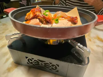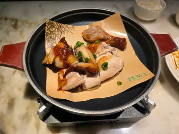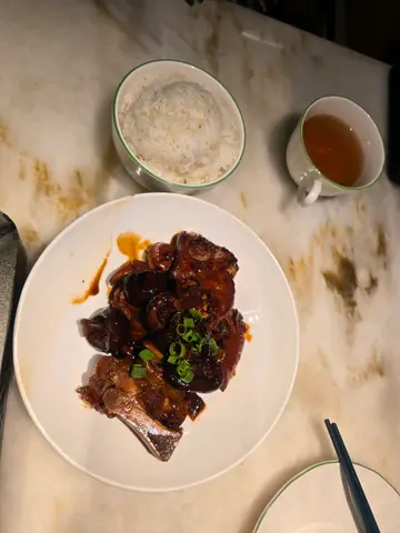葱香脆皮烤鸭 唔系广东烧鹅嘅味道。而系比较多五香粉嘅香味。个肉几嫩,皮唔算特别脆,但系整体好香口。伴住碟有一个似XO酱加橄榄酱嘅酱料,同埋大量有盐味嘅香葱。无论捞埋烤鸭一齐食,或者就咁攞捞白饭都非常之惹味。份量唔算大,但整体系几惹味香口好味。汤👌🏼陈皮菜蒲头老鸭汤 淡淡地老火汤嘅味道,唔算咸但系够味,感觉冇味精。❌