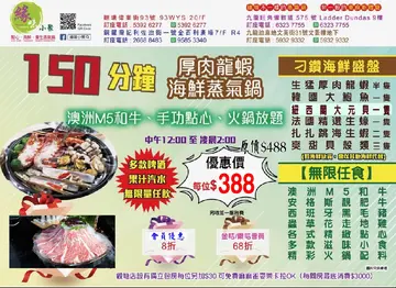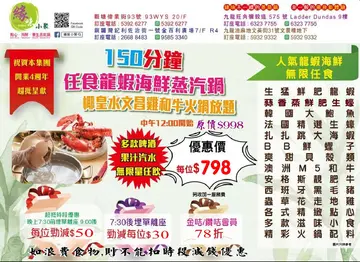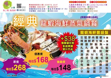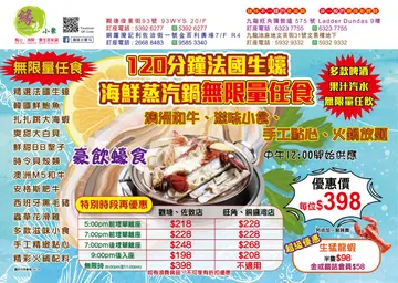 食物:种类不太多,相片中的基本上就是卖点,海鲜必食的款式,而且是任食,食得出海鲜是新鲜的,只有好少部分贝壳类没有开壳(死了),饮品也是任饮!但蒸点心方面,上菜速度慢。服务态度:员工服务态度积极,热心服务客人但因为人手不足问题,只帮我们蒸了两度𩠌菜就忙住帮其他枱客人蒸,而且蒸点心也没有时间去蒸,导致出点心速度极慢!环境:卫生整洁干净,最重要是厕所没有异味。而地上没有积水,运送海鲜过程妥当(听说观塘分店是满地水积)整体而言,支持香港店舖,但对比起内地任食海鲜,性价比还是没有得比,始终内地平,款式又多,香港可以尽量参考下改善下。…查看更多