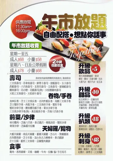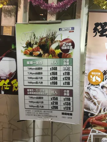 与家人庆祝生日!而知道她们都爱食放题!我们就选择左去元朗呢一间Together !一去到都己经门口劲多人等位!好在之前打左去订位,所以唔洗等得太耐!刺身,寿司都新鲜既,同埋都唔会话写十件,先黎得个三件,写几多,都会黎几多的!因为我之前去某一间放题,真系会咁样的,而呢间都无咁既情况!呢到又有生蚝,松叶蟹!样样都唔差!我们挂住食,都忘记左影相!同埋呢到价钱都好平好抵食!甜品仲要有雪糕,雪条,奶冻,啫喱,好多选择