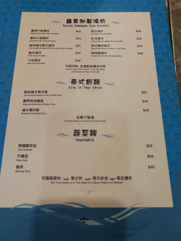 环境比起泰式风情,更令我觉得陀地。menu唔多,价钱亦令我好surprise,呢个地段竟然都做到接近街坊价(后来发觉同份量有关)猪肉什锦汤河虽然俾朋友warn过size,但上菜时都系一shock,真系冇见过用咁迷你同扁嘅碗装汤河。讲返味道,猪肉切成一块块有啲厚度,咬落仲系爽口,一啲肥肉都冇,又唔'hai',非常唔错。汤底够浓,粉煮得岩岩好