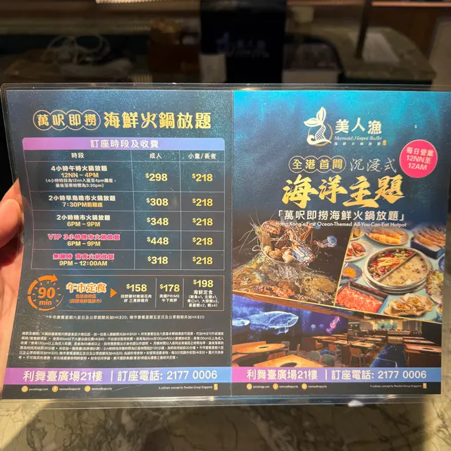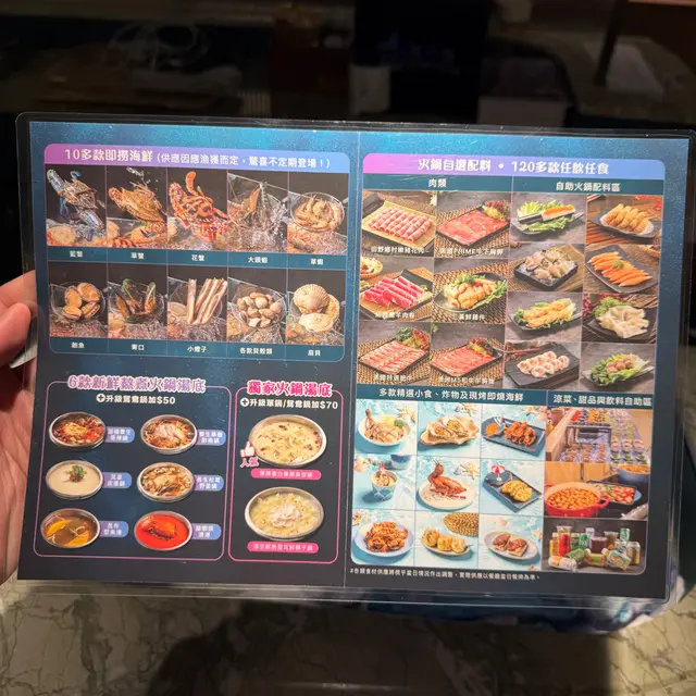 报纸介绍十分吸引,在Openrice 准备订台,看见一些十分负面食评,犹豫一阵,最后去试试。周日晚七点,入场后陆续坐满全场,久违了的铜锣湾爆场。马上点了龙虾汤底,再去选海鲜。虾都是游水的,当时祗有较小的三点蟹 (后来加了些较大的),但蟹肉鲜味。鲍鱼很易咬,牙齿不太松的长者应能咬到。拣完海鲜回台时,汤底已送到。QR code 选的食物不多,M5和牛好味软口,牛肩浓味,羊肉OK。看见有些留言说服务很差,我和太太完全不认同,我先后问过五位服务员,他/她们都有礼貌的帮忙,空的碟也自动替你收(我们是坐到很入的角落),以爆场的情况是十分难得。惊喜是长者有优惠,周末晚原价$328再加一,长者加一后也不用$245!!!离开时门外已有七、八人等待九点一轮。整体说食物不错,虽然选择未算很多,服务绝对算好,价钱对长者则非常扺啦