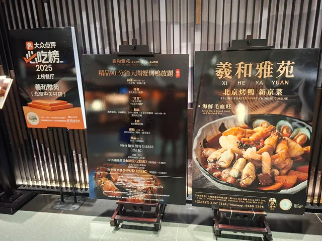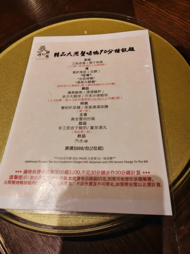 話說我同朋友都係大閘蟹嘅狂熱粉絲,一見到羲和雅苑有大閘蟹放題,立刻gogogo~!之前都唔知佢有呢啲offer,見到即刻心動,心動不如行動。加上我以前食過佢嘅片皮鴨,印象唔錯(廢話,如果唔係點會喺中國開咗40間分店,仲以過江龍姿態殺入香港?)時間管理我哋book咗8點session,大約等咗5分鐘入場,20:05正式坐低。任食時間係90分鐘,埋單時間係21:17——大家可以do the maths。雖然差咗幾分鐘,但老實講,對我整體dining experience影響唔大,因為重點唔係時間,而係……裝修羲和雅苑香港店由曾登上美國《室內設計》封面嘅設計團隊操刀,中式典雅融合摩登風格,再加上維港美景,真係無得輸。但可惜,食物就……食物逐樣講前菜:三色皮蛋清爽開胃,係成晚最穩陣嘅一味。湯:黃扒魚肚湯底還好,但魚肚未入味,口感偏硬,好似未夠時間煮。放題烤鴨:第一輪:仲老過我同朋友加埋嘅歲數,乾過我哋荷包,凍過我個心。如果佢攞住呢盤嘢去北京話係代表北京烤鴨,我真係驚佢會俾人圍毆。失禮人。而且烤鴨個餅皮要三催四請先送上,本身已經夠凍,等埋就更凍更乾。第二輪:有改善,至少有溫度,但同我上次食嘅片皮鴨係兩回事。可能套餐同散叫真係有分別。不過同平時比都係差d,不如烤鴨唔好做放題啦,直接每人一個portion ;起碼保持水準吖。大閘蟹(母):佢真係可以註明只供母蟹,唔係唔得,但要講清楚。蟹嘅size偏細,可能同季節有關(小貼士:秋初蟹細,秋尾蟹肥)。第一輪唔夠熱,之後就好啲,起碼夠熱。但到last order時,我哋想叫多幾隻蟹,就話最多3隻——呢啲限制真係要講清楚。如果心痛啲蟹,就唔好做放題;直接俾每人一隻夠斤兩嘅蟹咪算囉。做放題,就要預咗有啲客係真係會食得多嘅。精品:鮑魚夠淋夠入味,值得一讚。