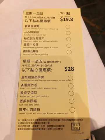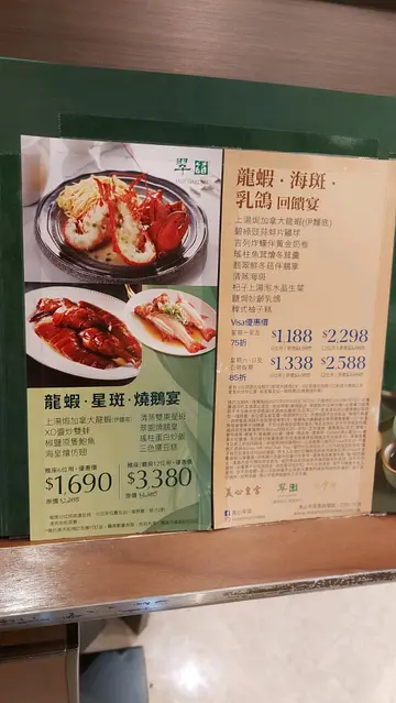 翠园(元朗店)中秋节, 屋企人做节, 拣咗元朗形点一期商场嘅翠园. 方便就脚, 食物质素都唔错. 抵唔抵就见仁见智啦.呢个六人套餐 $2080上汤加拿大龙虾伊面、翡翠带子珊瑚蚌、香脆百花酿蟹钳、竹笙海皇烩燕窝、原只鲍鱼伴花菇、清蒸沙巴花尾斑、鲜虫草花银芽翡翠苗、脆皮一品烧鸡、四季荷叶饭、美心迷你冰皮月饼. 再加多一个瑶柱虾干节瓜筒 $128我哋八个人够晒食, 加一后共$2517人均$315 可能系节日啰, 我觉得就贵咗少少.不过我欣赏翠园回归本源,著重食材本质,不添加味精,引领食客沐碧荫,品原味。凭大厨千锤百炼的粤式巧手、精心搜罗的当造食材、对饮食文化的不懈钻研、及清雅脱俗的用膳环境,食客有如漫步竹林大道上,舌尖五感浸沉翠园氤氲,以心细尝君子之美膳。讲下我最钟意嘅 ~ 百花酿蟹钳「鲜、弹、香、脆」四种口感完美结合. 佢能做到· 外观色泽金黄均匀, 形状饱满圆润. 外皮薄而香脆, 不含油. 虾胶口感爽脆弹牙, 绝不粉烂或过实, 鲜味十足. 蟹肉熟度刚好, 保持鲜嫩多汁, 鲜甜味突出. 整体嚟讲, 蘸一点喼汁, 送入口中, 外脆内弹, 鲜香交织, 齿颊留香, 而且吃完后盘底没有多余油分. 超正!仲有 ~ 四季荷叶饭饭粒干身香, 配料层次明, 荷香渗入心. 一开荷叶, 扑鼻而来的是浓郁的荷叶清香,令人食欲大振. 米饭与配料色彩缤纷(虾仁的红、芥兰的绿、香菇的黑、蛋丝的黄),呈现「四季」之感. 色香味俱全.地址:元朗朗日路9号形点 I 第二层 2039号舖电话:22593538…查看更多