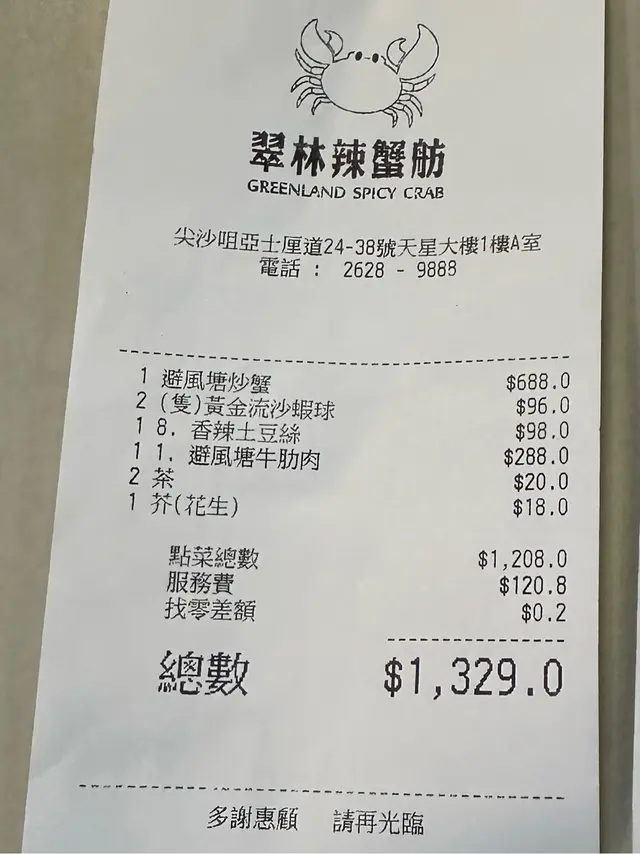 翠林辣蟹舫 (尖沙咀) 网上订位享特别优惠并赚Rice Dollars 网址: https://s.openrice.com/QrLS0yOc400 地址: 香港尖沙咀亞士厘道24-38號天星大廈1樓A號舖 电话: +852 26289888