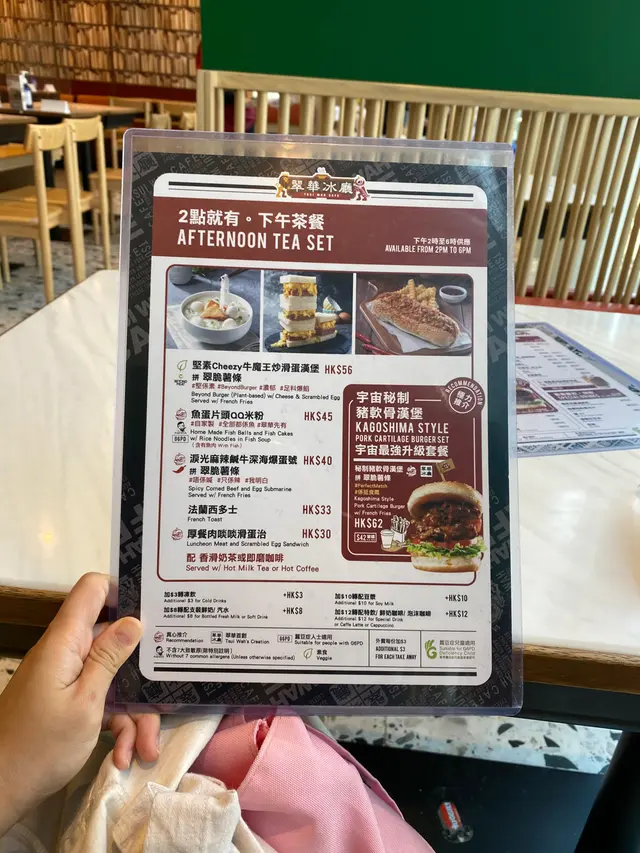 夠晒份量既午餐 sweet_tang等级22020-09-02861 浏览 关注 十一點多,好多餐廳都仲未開,行過翠華,見裝修幾靚,於是入去試下。點了一個A餐,豬扒配薯菜。賣相幾吸引餐湯是周打湯,有薯仔粒、洋蔥粒、碎椰菜,同埋好似有少少火腿肉碎,不太鹹如果可以杰返少少就更好。主菜是煎豬扒,好腍同有肉味竟然有兩大塊 差點食唔晒。個汁有很多碎本菇,感覺幾新鮮同健康。粗薯條好正大大條,熱辣辣,但唔油膩,又夠薯仔味。而且佢冇落鹽,可以自己調校鹽的份量,或者伴茄汁食又得。奶茶夠濃夠滑,可惜我食得太慢,擺凍了,嗅不到茶香順帶一提,門口有麵包賣,係自家即埸焗製,現時買二送一,好抵,所以買埋麵包,又食又拎…查看更多以上食记乃用户个人意见 , 并不代表OpenRice之观点。赞好分享夠晒份量既午餐 翠華冰廳 https://s.openrice.com/QrLT0fFuv00检举 张贴 评分4味道4环境4服务5卫生4抵食用餐日期2020-09-02用餐途径堂食人均消费$61 (午餐)