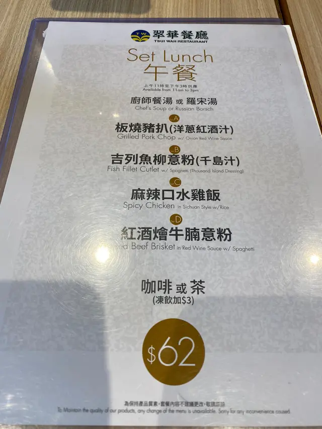 一錯再錯 Peppermint等级22021-08-16496 浏览 关注 搭完西鐵荃灣西落車,外面落住雨未停,因為星期日關係,好多食肆都要排隊。穿過灣景廣場天橋再到荃灣廣場,路過翠華,唯獨佢唔需要排隊,仲有我最喜歡嘅卡位,加上比佢放喺門口個餐牌吸引咗… 🤩厚切豬扒🤩黑椒汁… 都係我喜愛嘅元素,可以優先考慮🤓坐低咗睇完一輪餐牌後,發現佢係無炒粉麵飯嘅,睇真啲原來佢係「冰廳」😵💫好啦,就決定要晚餐啦,落單吧!點知經理話「厚切豬扒賣晒,會改為兩塊薄切!」咁都得?😧😧 我真係O咗嘴!唉,早知去商場對面嘅「紅茶」,不過我見外面落住雨又唔想走嚟走去,咁就妥協咗。朋友仔係公仔麵嘅鐵粉,叫咗個炒公仔麵。落完單過咗約半分鐘,經理又走過嚟話「黑椒汁賣晒,會轉燒汁」。。。嗰刻我呆了🐦🐦🐦 咩事呀大佬?個汁好難煮咩?定係無黑椒?我心裡有好多《👴🏿❓》如果唔係食食吓見個有人嚟見工,我真係以為佢係咪想賣晒啲貨就摺。感想:#做人唔應該咁易妥協 #又浪費咗一餐quota🤦♀️…查看更多以上食记乃用户个人意见 , 并不代表OpenRice之观点。赞好分享一錯再錯 翠華冰廳 https://s.openrice.com/QrLT0PFSz00检举 张贴 评分2味道3环境2服务2卫生1抵食用餐途径堂食