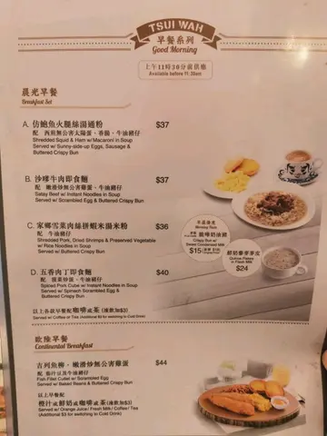 入到去 先睇睇餐牌有A餐火腿通粉 配太阳蛋 肠仔 猪仔包B餐 沙嗲牛肉面面 配 炒蛋 猪仔包C餐 雪菜肉丝米粉 配猪仔包 D餐 五白肉丁面 配 炒蛋 猪仔包 见到每一个餐面系有猪仔包 , 但分配不同 , 价钱都不同 。 留意❗️❗️❗️❗️ : 不得自由配搭 即是火腿不能转面 , 沙嗲牛肉不能转米粉 , 肉丁不能转通粉⋯⋯