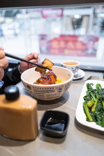#神之叉烧饭 套餐 $128我们品尝了神之叉烧饭,搭配白灼菜心苗、海鲜豉油,还有一杯冻蜂蜜柠檬茶。叉烧的肉质鲜嫩,酱汁香甜可口,让人一口接一口。