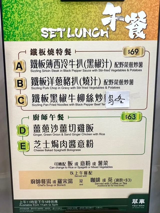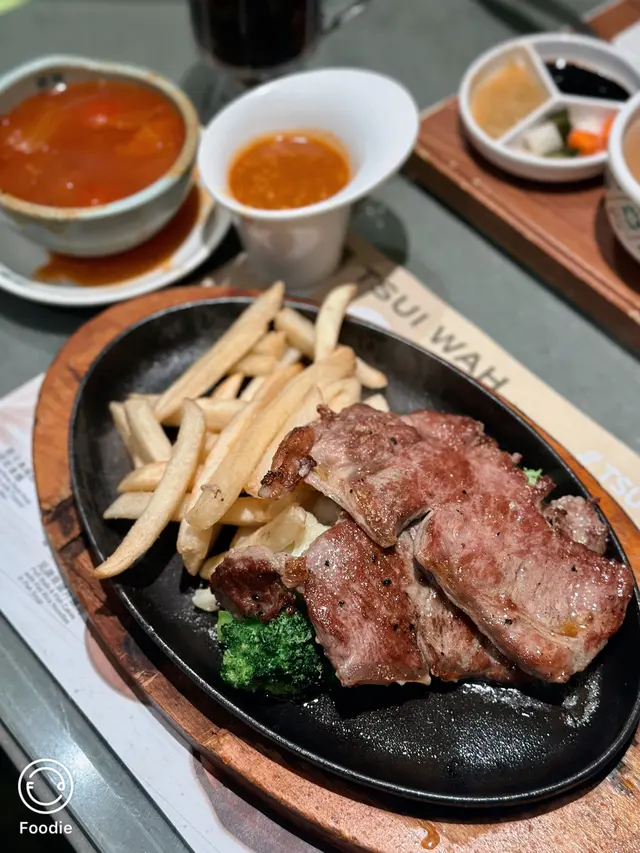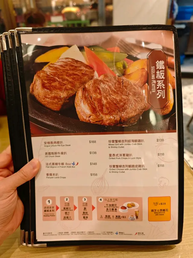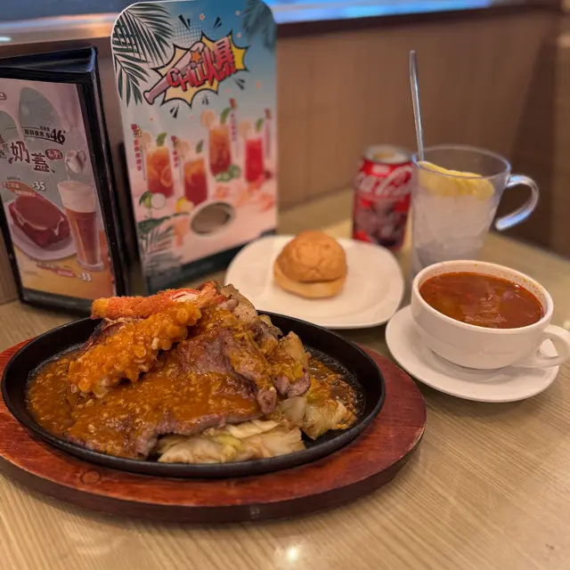 午餐鐵板黑椒牛扒配薯菜可轉作蒜蓉汁,口感豐富