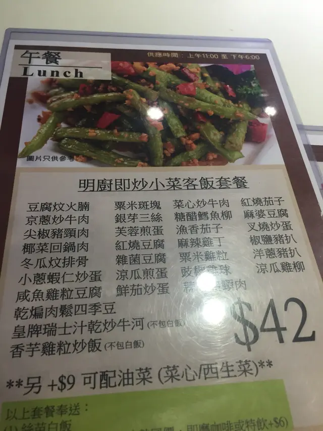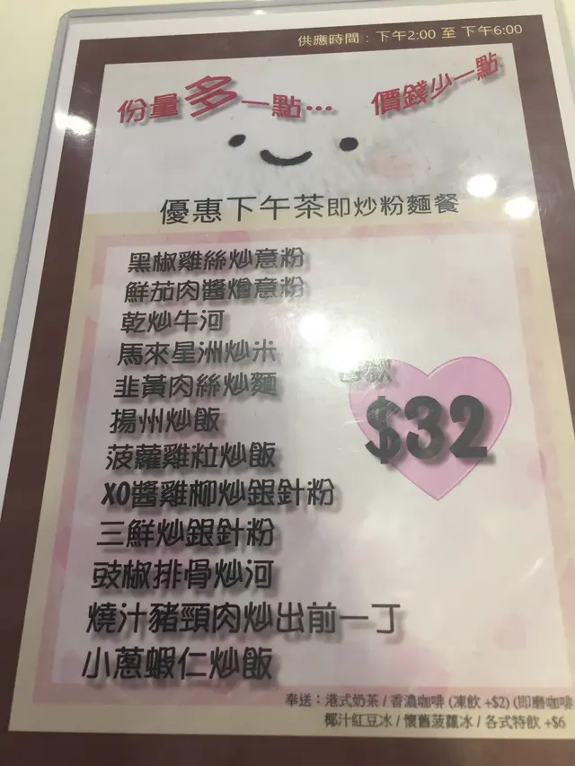 五點幾嚟到,樓上坐滿晒,原來下面仲有一層😱嘢食好多選擇,有下午之餘,佢午餐做到6點,不少小菜都係$42, 好抵👍🏻👍🏻👍🏻👍🏻由於我哋都幾餓,怕下午茶細份唔夠,大家都咗午餐,得一個朋友叫下午茶嘅炒飯。嚟到大家都幾滿意食物,下午茶嘅炒飯都好足分量,朋友仲食唔晒添。茶餐廳來講佢都算幾乾淨,侍應都好友善,好有禮貌,我哋諗左好耐先叫嘢食,都完全冇催我哋。又主動話俾我哋知Wi-Fi密碼!下午一定會再嚟,抵食啊👍🏻查看更多