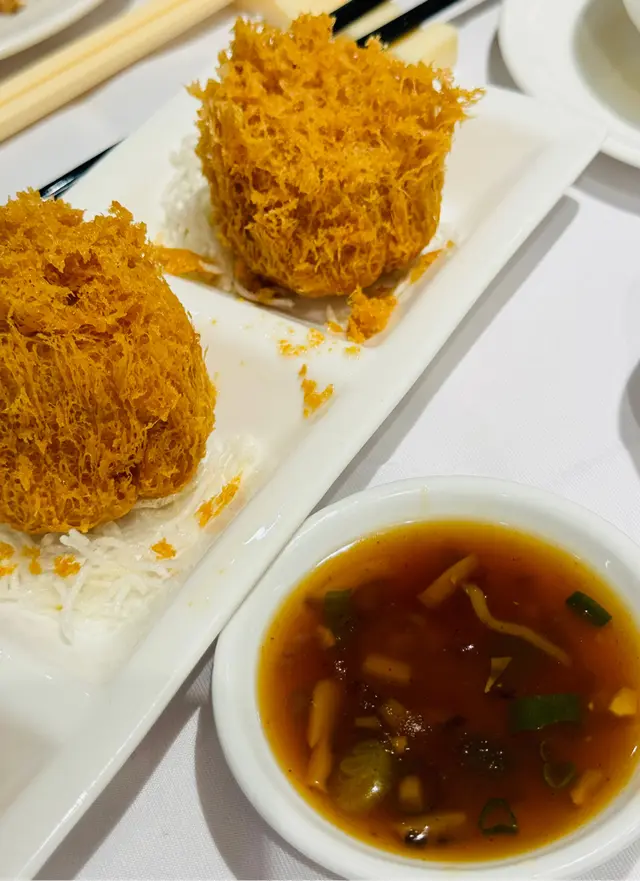 🔥山竹牛肉球一籠三顆的牛肉球果然名不虛傳,每顆都有乒乓球般大小,表面光滑飽滿,透著淡淡的粉紅色澤。用筷子輕輕戳開,質地緊實卻不失彈性。入口第一感覺是牛肉的鮮香濃郁,選用新鮮牛冧肉手打成漿,保留了適量的肉纖維感,不像機器攪拌的那般過分細膩。最難得的是加入了適量馬蹄粒和陳皮,馬蹄的爽脆打破了肉質的單一口感,陳皮的清香則巧妙中和了牛肉的膩感。醬汁調配得恰到好處,不會過鹹而蓋過牛肉的本味。底層墊著的腐竹吸收了肉汁的精華,變得軟糯入味。這道點心看似簡單,卻處處見功夫,絕對是老師傅的手筆。🔥蜜汁叉燒包一籠三件上桌,包子白白胖胖,表面開花均勻,透出內裡誘人的蜜色。輕輕掰開,包皮鬆軟綿密,帶有淡淡麵香,證明發酵時間掌握得精準。內餡的叉燒選用半肥瘦梅頭肉,切丁大小適中,蜜汁香甜而不膩,帶有適度的黏稠感,與包皮形成完美搭配。🔥灌湯餃這道點心最見師傅功力。餃子外型飽滿,皮薄如紙卻能完好包裹住豐富的內餡。用筷子輕輕提起,能感受到湯汁在內裡晃動的重量感。小心咬開一小口,滾熱的湯汁立即湧出,鮮美無比。湯底明顯是用老雞、火腿等上料熬製,濃郁卻不油膩。內餡包括鮮蝦、豬肉、冬菇等材料,每樣都切得細碎卻不失口感。查看更多