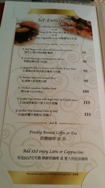 今午约了好几个老尖旧同僚聚见聊天,当然谈天说地,天南地北,饮饮食食,他们是老尖地胆兼食得玩得!我们选择食店宗旨是又便宜,又好味,又要环境清静,食物不错!此西餐厅有季节性时段出品不同各样各式食物,上次有香草烧春鸡,直情有口水直流,滑顺脆嫩!我选择是:鸡胸烟肉忌廉意粉!包括餐饱及南瓜忌廉汤(黄汤)、罗宋杂菜汤(红汤)!老朋友是:虎虾意粉及纽西兰肉眼牛柳餐!又倾又食感觉超对味,软绵滑腻,食之有味!说真话,又便宜,又新鲜,又享受美食之余,又可聚朋友之情,正是人生一乐也!…Read More