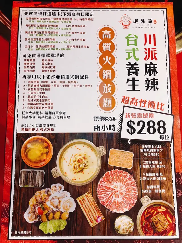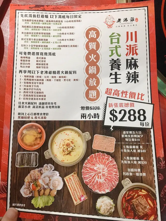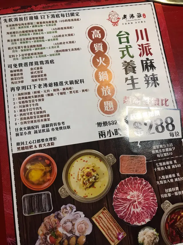 老沸爺火鍋裝修帶古式風味 古色古香😻😻老沸爺有2種套餐可以選擇, 價錢分別係$288同$188🙈湯底方面$288套餐可以揀燉湯店員話燉左4個鐘 好補身好老火湯味道仲可以免費轉做鴛鴦湯底麻辣湯底都唔係好辣海鮮拼盤有元貝 生蠔同蝦鮑魚好大隻好新鮮彈牙😚😚雪櫃仲有不同蔬菜類任食😻肉類方面牛肉最吸引肥牛都唔錯小食 飲品 前菜 配料 全部任食啤酒都係任飲🤫🤫冰粉推介啊 解辣超有用原味好食 食左3碗🥰🥰🐽老沸爺火鍋銅鑼灣堅拿道西10號冠景樓1樓B室…查看更多