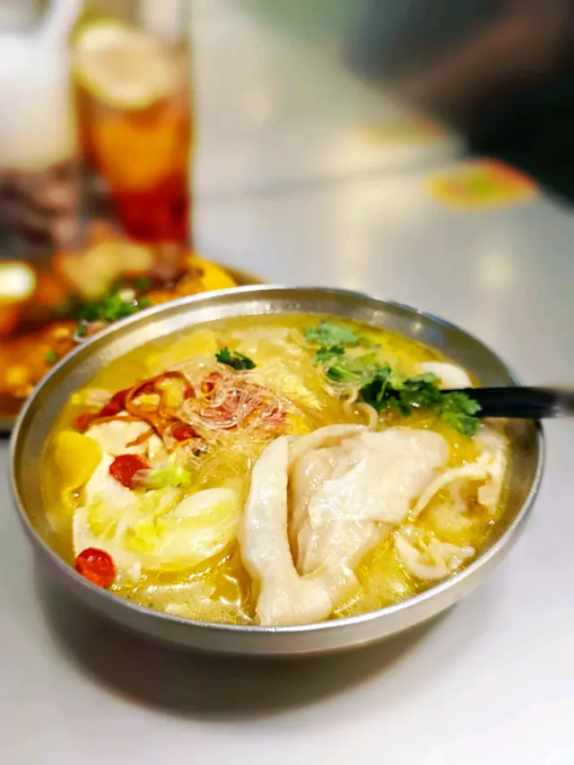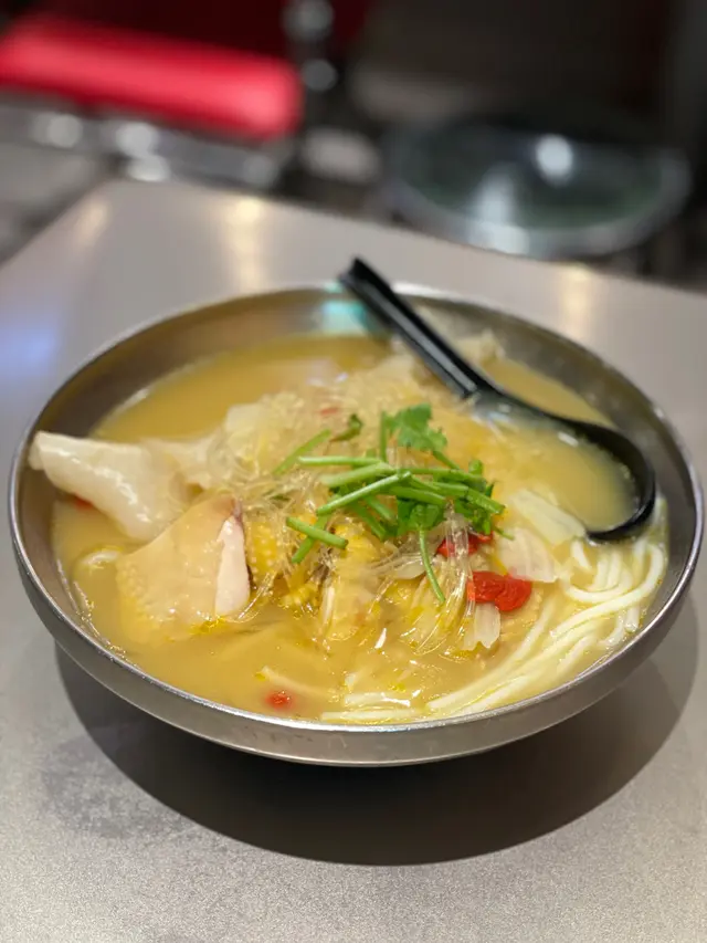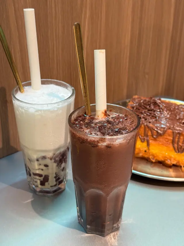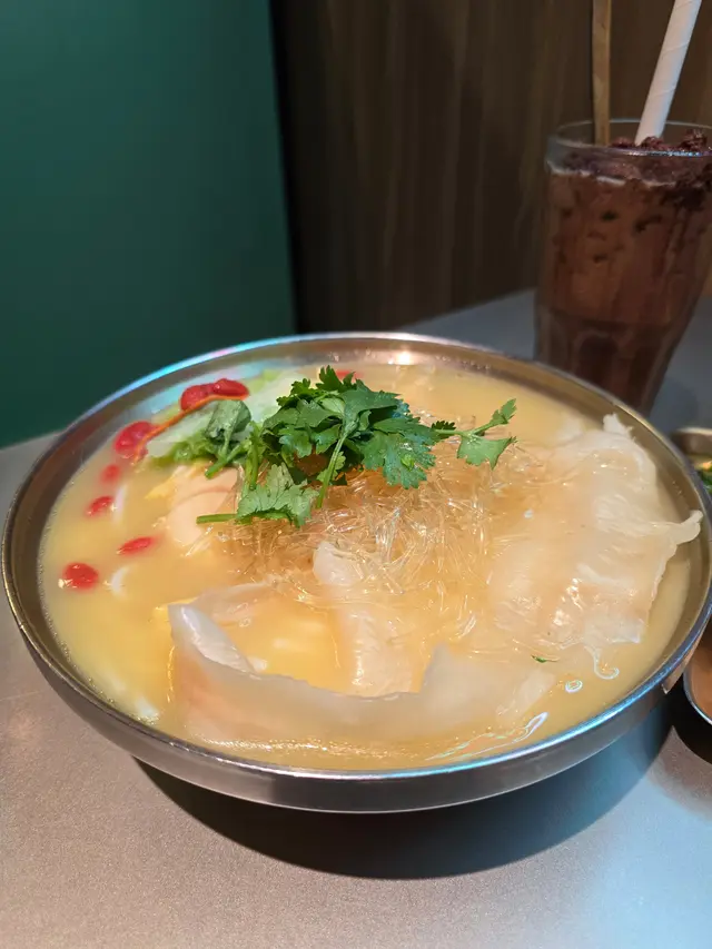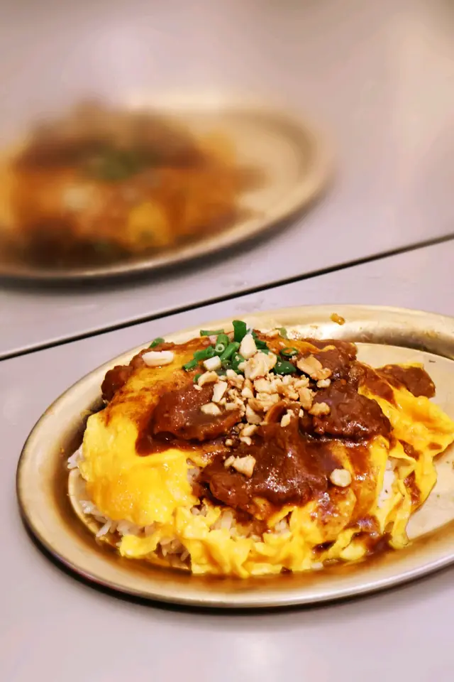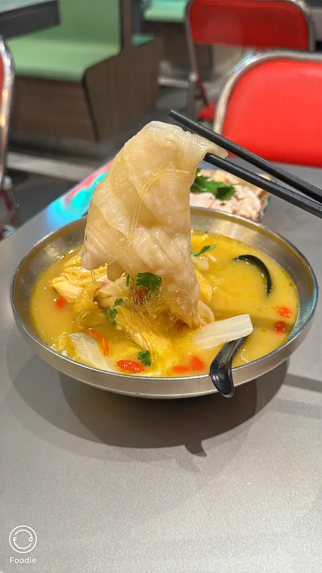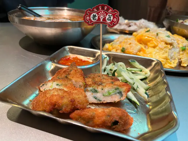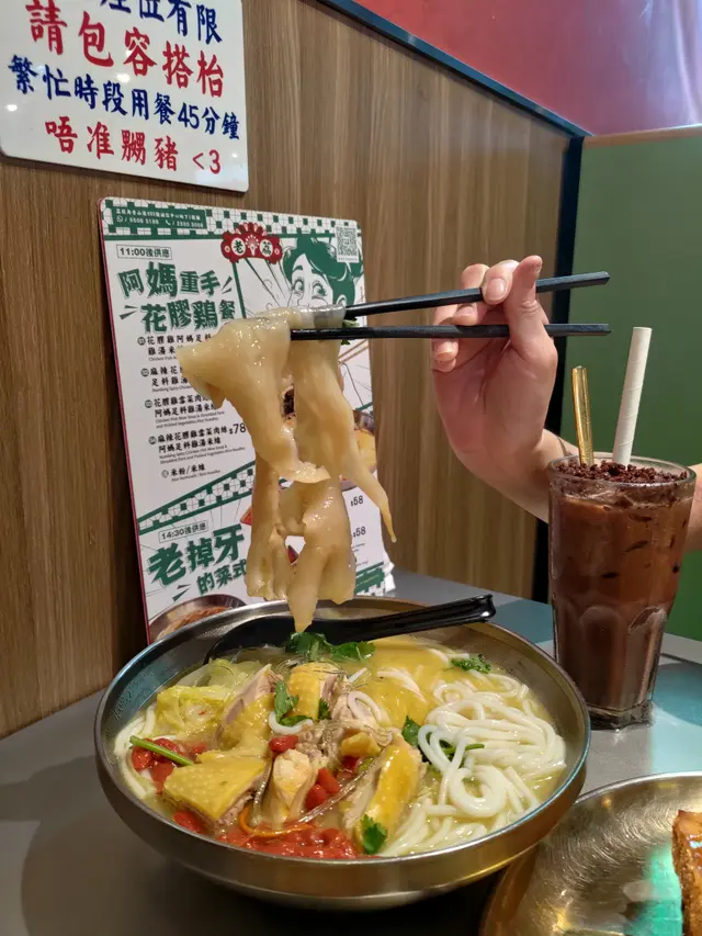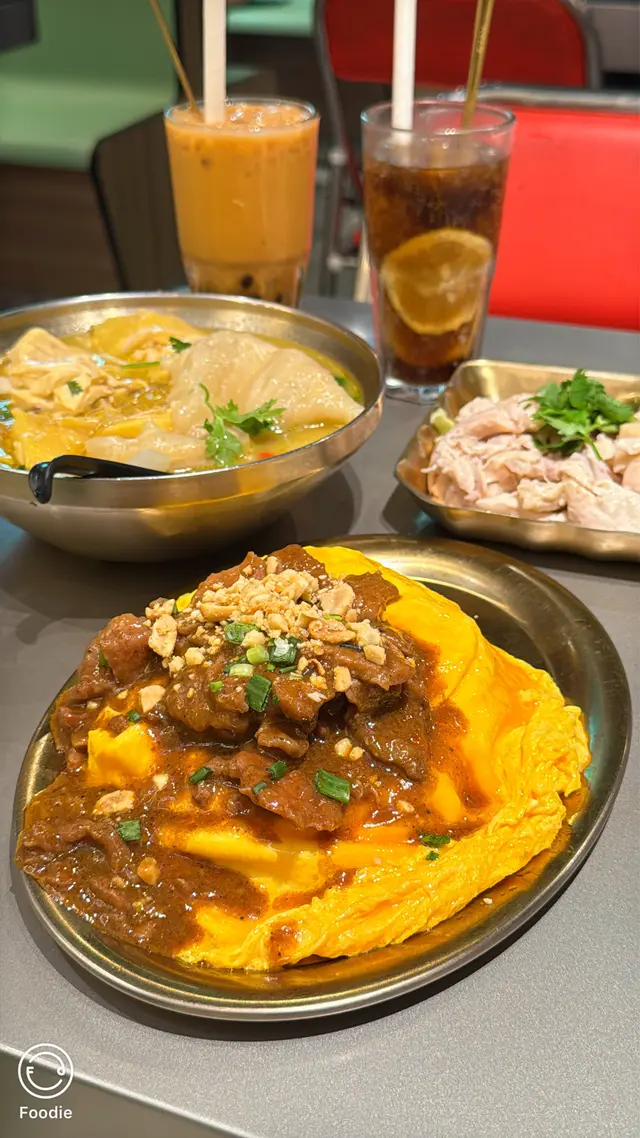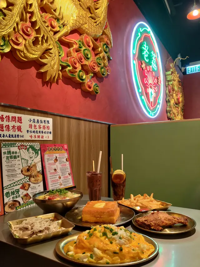 餐廳有著一個色彩繽紛的門口, 裝修像大戲戲棚般, 一看就知是老荔冰室, 非常吸睛! 🤩 連室內牆壁都有對小龍鳳, 有大量金句, 裝修滿有心思, 不過始終地方細小, 會有點迫, 但都依然有很多人排隊用饍, 證明有其吸引之處 🙂↕️滑蛋沙爹牛肉飯 $72加了大量醬汁及輕微花生醬, 鹹中帶甜, 完全不辣, 是重口味之選 😏 牛肉軟腍, 但滑蛋更出色, 做到半熟狀態, 更加滑溜! 另外加了很多細小花生碎粒, 我個人就不太喜歡, 有點格格不入 🙃花膠雞阿媽足料雞湯米線 $72鮮蝦餅小棠菜配酸辣米線 $58花膠雞煲是其中1道招牌菜, 入面有很多配料, 杞子, 雞肉, 當然少不了花膠, 還有素翅做點綴 😚 花膠蠻大件的, 這個價錢不可能要求又厚又粘性高的花膠, 至少花膠不會很硬! 唯一問題是整碗米線不夠味, 同時都證明它無添加味精 😌 反而酸辣米線惹味更多, 蝦餅即叫即炸, 入口彈牙。增肌蔥油手撕雞 $48以有約65g蛋白質做賣點, 可以配蒟蒻麵一起吃, 專門為做gym人士而設, 除了補充蛋白質, 亦不會像平時gym友吃的烚雞一樣冇味肉質粗糙 😬金沙朱古力流心西多士 $52這個是我最期待的食物, 3層厚的麵包堆砌而成, 麵包十分軟熟, 上面鋪滿朱古力, 想不到是脆的! 單是外觀已經很震撼 😍 切開預期的流心一刻, 可惜失望了, 並沒有流心的 🫠 雖然如此, 味道依然有濃郁朱古力味。椰汁紅豆冰 $26奶茶紅豆冰 $26…查看更多