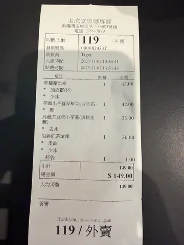 今天就是要一尝珍珠红茶厚拿铁! 来自台湾的老虎堂黑糖专売,凭藉「虎纹挂壁」的黑糖珍珠鲜奶红遍港台,这次来到铜锣湾分店,决定试试他们的另一饮品——珍珠红茶厚拿铁,看看是否真的能重现台湾夜市那种让人上瘾的甜蜜滋味~ 🔸 珍珠红茶厚拿铁|含奶霜 ⚡️ 好味指数:★★★★☆ (4/5) 🧀️ 卡路里:约450kcal/杯 💰 价格:HKD 38 👉 香气:打开杯盖后,浓郁的黑糖焦香扑鼻而来,混合著红茶的醇厚和奶霜的甜腻,瞬间勾起台湾夜市的回忆🌃~ 👉 珍珠:✅ 绝对是亮点!珍珠煮得恰到好处,外层Q弹,中心软糯,黑糖蜜渍得入味,每一颗都充满焦糖香气,咬下去还会爆出微甜的糖浆💥。 👉 红茶底:茶味浓郁但不苦涩,带有微微的麦香,和黑糖的甜味平衡得刚好,不会像某些品牌甜到喉咙发腻。 👉 个人回忆:这杯让我想起在台北士林夜市,边走边喝老虎堂的幸福感——虽然价格贵了点,但味道确实有8成相似! 奶霜稍微偏甜,建议搅拌后再喝,否则最后几口可能会有点腻😅。 🌟 总评 (75/100) ✅ 优点:珍珠水准超高,红茶底浓郁🍯。 ⭕ 注意:奶霜偏甜,不爱甜的朋友可以选择「少奶霜」或「微糖」。 🙆♀️ 小建议:一定要摇匀再喝,让珍珠, 红茶和奶霜完美融合,每一口都是浓郁的甜蜜暴击!🐯💖