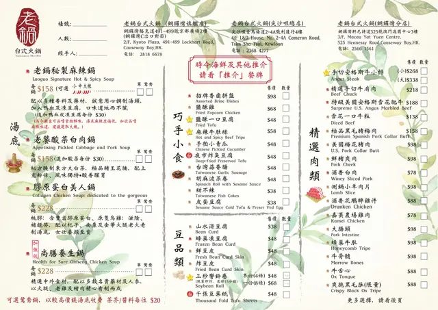 老鍋台式火鍋 (京都廣場) (铜锣湾) 网址: https://s.openrice.com/QrLS0C3S900 地址: 香港銅鑼灣駱克道491-499號京都廣場2樓 电话: +852 28186678