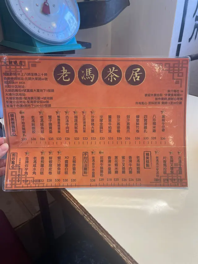 老馮茶居是懷舊港式茶居的典範,飲茶體驗令人一試難忘!餐廳以六七十年代香港為主題,紅罩燈、格仔地磚、公雞碗等復古裝潢,彷如時光倒流,充滿老香港情懷,適合打卡與回味。食物美味,點心即叫即蒸,保證新鮮熱辣。招牌老馮鮮蝦餃($33)皮薄餡靚,蝦肉彈牙;金牌炸芋角($18)外脆內綿,芋香濃郁;流沙芋泥包($20)爆漿香滑,甜而不膩。蟹子燒賣皇($32)足料鮮甜,咖喱蒸魷魚($32)濃汁彈牙,令人回味。環境舒適,服務親切,惟旺場需等位,建議早到或預約。老馮茶居以傳統手工點心與懷舊氛圍,完美呈現香港飲茶文化,無論與家人或朋友聚會,都是元朗不可錯過的美食地標!…查看更多