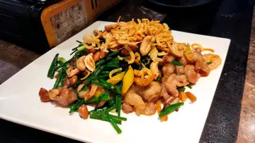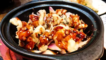 甫坐下,侍应生递给我们一盘洗碗用的滚水及餐牌。我哋研究咗一阵,就点咗以下几味小菜。菜式非常精致,兼且好有镬气。这个玛卡火焰鸡煲,全场只有我地一枱点咗。当著火一刻好多食客都望住个著火嘅鸡煲,好搞笑!
