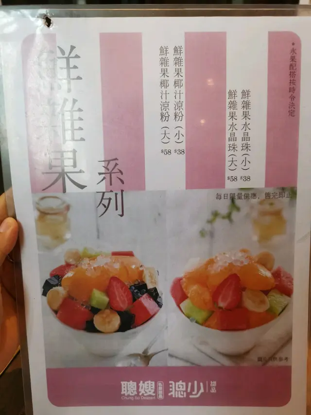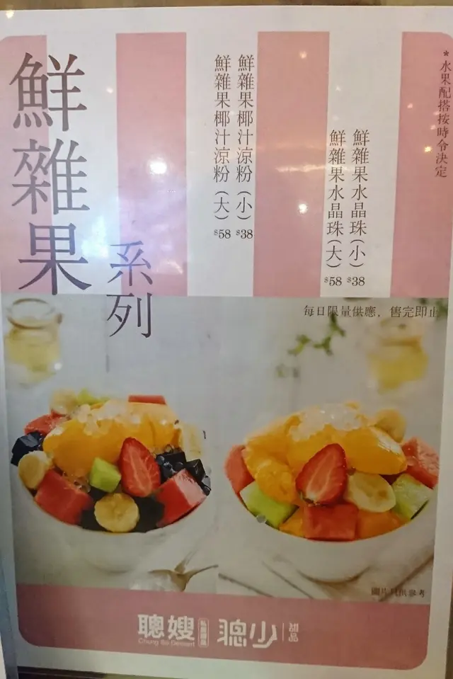 經過屯門站 突然想食甜品 所以就到v city去找找。 居然畀我找到一間叫聰少甜品。 這間甜品店不容易找, 要到地鐵站那層,一堆美容專櫃附近的一條扶手電梯,下兩層才可到達。假日下午六點鐘, 因為未到晚市時間, 所以人客不多。 我冇朋友選了高櫈的位置。天氣很熱, 首先選了一個凍冰的甜品。鮮雜果水晶珠(大) ($58)鮮雜果包括 蜜瓜 香蕉 西瓜 士多啤梨 芒果。 雜果下面是 冰凍的芒果冰, 芒果冰是這裏其中一個皇牌甜品。 雜果上面還有卜卜脆的水晶珠。 水晶珠沒有甜味,但卜卜脆感覺很有趣。 生果很新鮮,甜和有水份。 最好味的是芒果冰, 感覺像沙冰 ,不太甜, 很重芒果味。糖不甩 ($28)跟著點了一個很久沒有吃的傳統小食- 糖不甩。碗內有六粒糖不甩, 湯圓新鮮煮好, 熱辣辣。配上椰絲花生芝麻糖, 香噴噴,但略甜。假日可以舒舒服服嘆一個好味的甜品, 感覺非常好非常開心!這間聰少甜品的甜品質素不錯, 下次會再試其他甜品。查看更多