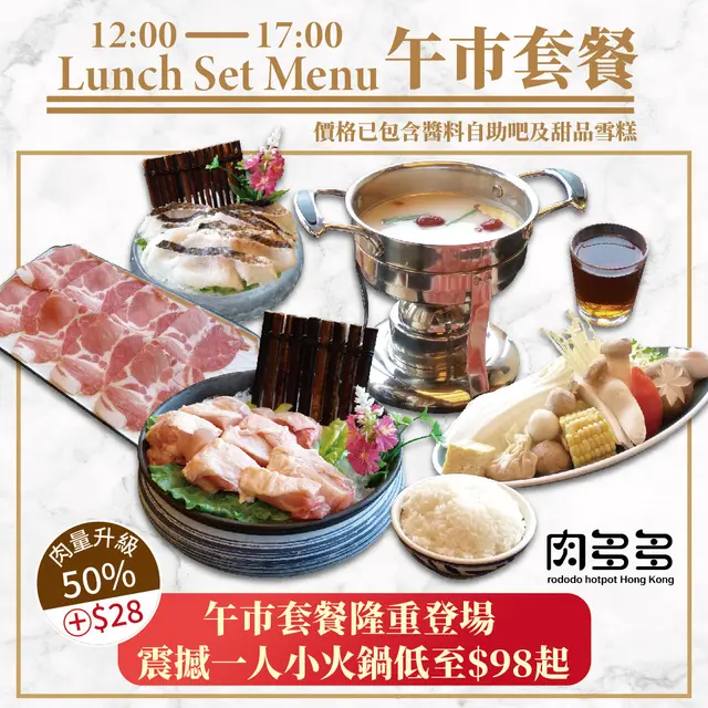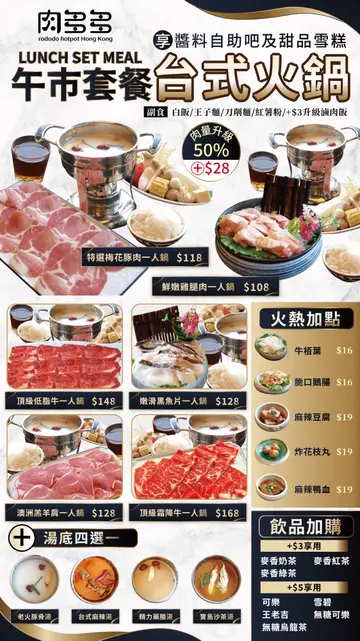 台湾过江龙之肉多多台式火锅,原来已经开左黎铜锣湾🤭台式火锅我最爱就是它们的汤底,尤其是药膳汤。真心好饮又养生。今日就黎试吓午餐既一人一火锅先,份量足料,价钱又便宜👍🏻美食推介:💛顶级霜降牛一人锅:霜降牛肉肉质非常嫩,入口即溶,片片油脂分布均衡,好食👍🏻💛嫩滑黑鱼片一人锅:一片片通透的黑鱼片,装饰为一朵玫瑰🌹只需在锅内涮3-5分钟便可以吃,鲜甜味道,没有任何的腥味👍🏻💛火锅材料丸及什菜:跟餐会有各一盘的鲜什菜、菇菌、饺子、什丸等,其中一颗丸是我最爱的包心芋头丸,皮薄芋泥馅十足,好好味👍🏻💛王子面及刀削面:跟餐亦可选白饭、王子面、刀削面、红薯粉等等,我选了王子面及刀削面,王子面似我们以前的x字面口感一样,而刀削面烟烟韧韧的口感。💛汤底:当然选了药膳汤底,药膳味道超浓超足料,汤底一上已经忍不住喝了半碗🤭。另外,选了沙茶酱汤底,浓浓的沙茶酱,配上牛肉或鱼肉也相当出色👍🏻💛甜品:自助吧提供仙草、寒天、芋圆任吃,热辣辣过后叹一碗超清爽。另外,跟餐还有雪糕一杯。超级满足😌**侍应招呼相当亲切👍🏻👍🏻👍🏻**台式火锅价格便宜有质素👍🏻👍🏻👍🏻…查看更多