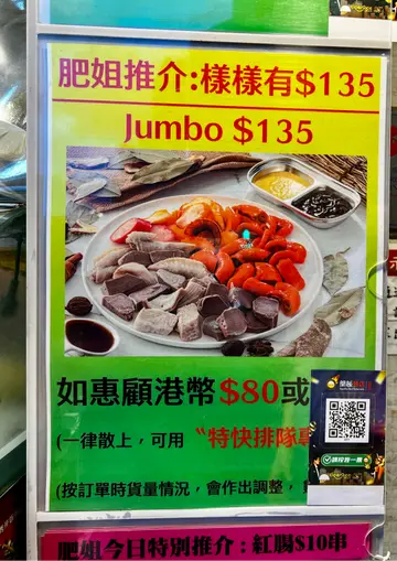 肥姐小食店果然十年如一日, 食物和人龙都是。都有不少人排队, 还好不用等很久, 五分钟内便取到食物开餐, 合乎香港人的生活节奏, 我喜欢。可惜的是小生肠和猪头肉已经卖光, 但都点到皇牌, 都算欣慰。火鸡肾和墨鱼我还好, 大生肠很爽口, 没有异味, 清洁功夫做得很好, 吃得安心, 断口性好, 想不到凉拌串烧都那么好吃, 真是值得光顾。我还点了猪颈肉, 好吃耶, 想不到不用热食都可以那么好吃。酱汁给得很足, 但芥末有点太多, 可以少一点, 可以自行选择拨走, 但店家给得很足料这一点很值得一赞。…查看更多