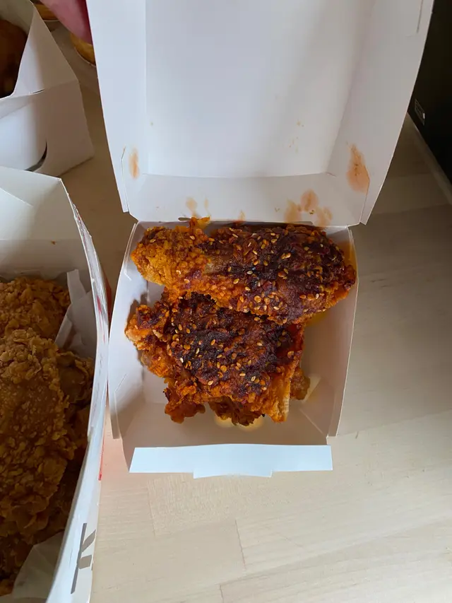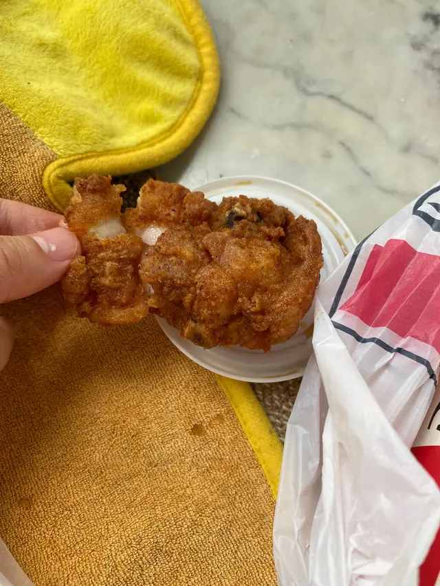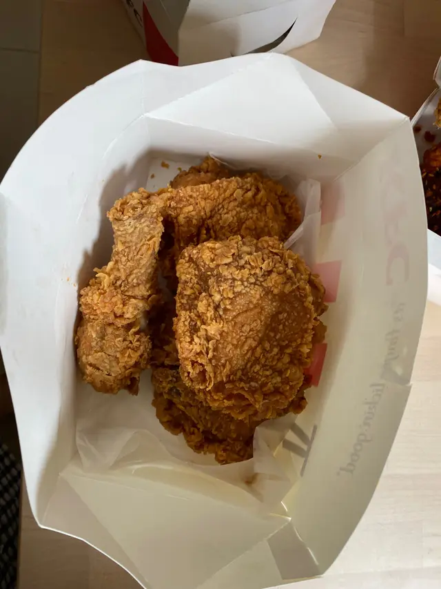 細隻過包紙巾架雞肉,仲要不停加價 味超級死鹹 disappointed ,blacklisted even i am fie hard fans , no longer support kfc anymore .the chicken is very small ,u can see from photo as smaller as a tissue ,very salty and the price adjust and raise more then 10%bought a$59 set ,not full查看更多
