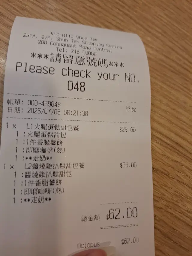 今日好早就去咗上環,見有啲時間就去咗KFC食咗個早餐,用咗佢哋個會員優惠$27.5就叫咗個醒神雞扒套餐,我之後睇返幅圖先知明明係麵包,但係出嚟點解係鬆餅嘅🤨🤨講返個餐先:有一個鬆餅、一塊雞扒、一條腸仔同一杯嘢飲雞扒都幾細塊,有汁係上面,略嫌鹹咗少少😑😑腸仔就粗粗短短咁,咬落有飽滿嘅感覺,但係都咸咗啲😐😐前後食咗兩個重口味嘅嘢,胃有少少Heavy😔KFC鬆餅就出名乾㗎啦!但今次有驚喜雖然都係乾,但外皮鬆脆甜甜地都唔錯😀😀中和返d咸味,如果襯返麵包配落雞扒醬會好啲😝😝要讚係服務幾好,男店員有笑容😊😊,說話清楚!早上就比到客人清爽嘅感覺😚😚,心情都開心d😁😁查看更多