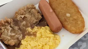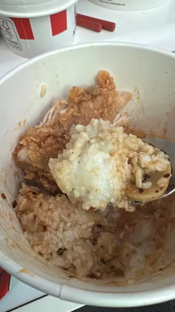 难食,同埋好细条 超幼,应该同条肠差唔多粗今早特意试了KFC的早餐,整体体验只能说是中规中矩。我点了一份包含炸鸡扒、肠仔、炒蛋、薯饼和通粉的套餐(从图片看,似乎是某种特惠或精选早餐)。先说主菜部分。炸鸡扒份量足够,配上蘑菇肉汁(Gravy)是港式快餐的常见做法,味道还算搭调。炒蛋色泽金黄,但口感略嫌不够滑嫩。肠仔和薯饼是标准的快餐配置,没甚么惊喜,也没甚么大错。通粉方面,那个弯弯的螺丝粉(Cavatappi)放在清汤或鸡汤中,有种独特的港式风味,不过汤底味道比较淡,面体煮得还算软硬适中。最令人失望的是那条「油炸鬼」(油条)。它外型细长,像一条加长版的甜甜圈,跟传统中式早餐那种粗壮、蓬松、充满气孔