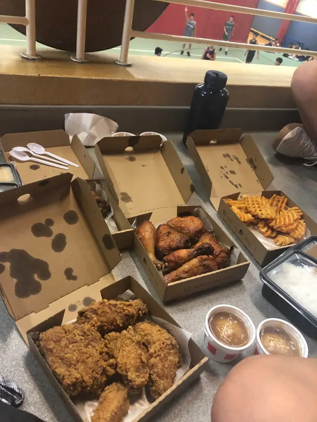 叫了外賣到比較偏遠的體育館,叫了一個四人餐,有家鄉雞,香辣炸雞,燒雞,巴辣香雞翼,兩客薯蓉,兩客粟米,還有一大盒的薯格,還有汽水。除了食物因運送而冷掉了外,還有就是沒有給手套。查看更多