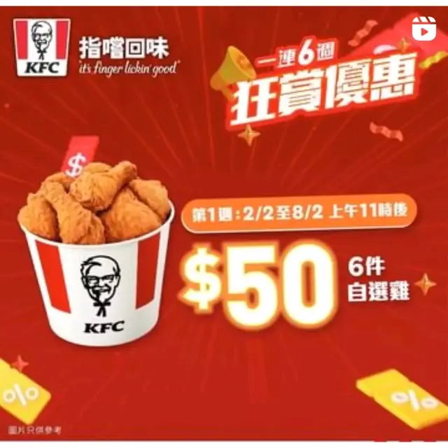 肯德基家鄉雞 (KFC)今晚屋企無煮飯,碌碌下ig見到kfc又做優惠, 今次又係做$50六件雞優惠,不過今次唔係每個電話號碼只准買一次,而係無限次使用,只要用KFC App落單買就得,大家要有心理準備可能要等2粒鐘先拎到雞,唔好咁早落去拎!今次雞肉超嫩滑,我最鍾意越多人排隊,d雞就越好食,完全唔鞋唔乾,又大隻,勁正!2人總共價錢$50個人口味總評分:9/10地址:葵芳榮芳路9號恒景商場地下G06-G07舖【KFC App 限定 #1連6週狂賞】本週優惠— $50 | 6件自選雞!掃!掃!掃!全力掃😍!KFC App今日開始推出一連6週嘅狂賞優惠,仲要個個星期唔同,一於掃到盡🤑!首先打頭陣嘅有$50 - 6件自選雞🍗,平均唔駛$9就有1件你至愛嘅 #家鄉雞/#香辣脆雞/#狂惹香燒雞!!!想知道之後幾個星期嘅優惠?睇埋落去你就知👇🏻:✨本週優惠:2月2日至2月8日 上午11時後6件自選雞 $50✨第2️⃣週:2月9日至2月15日 上午11時後2件經典葡撻 $10✨第3️⃣週:2月16日至2月22日 上午11時後5件上校雞寶$10✨第4️⃣週:2月23日至3月1日 上午11時前家鄉雞扒包買1送1✨第5️⃣週:3月2日至3月8日 上午11時後4件巴辣香雞翼+汽水 (中) $20✨第6️⃣週:3月9日至3月15日 上午11時後巴辣雞腿包+汽水 (中) $20即刻成為KFC App會員,狂賞優惠券即刻到手🥳: http://bit.ly/3Hi3skb@kfchk#kfchk #kfc #肯德基家鄉雞 #香港美食 #hkfoodie #hkfoodblogger #hkfoodpic #hkfoods #hkfoodshare #dessert #hkdessertshop #food #hkfoodstagram #hkfoodpic #hkigfood #foodiehk #yummy #delicious #foodie #hkfoodieblogger #hkfoodies #wheelchaireatinhongkong查看更多