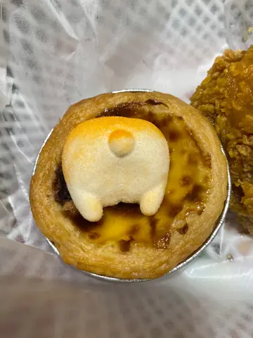 今日去咗KFC,试咗佢哋嘅一款新奇小食!就系呢个香港首创嘅朱古力棉花糖葡挞啦。望落去,蛋挞个皮烤到金黄香脆,好似喺发光咁,真系诱惑死人啦。蛋挞中间嘅蛋浆颜色靓到好似初升嘅太阳,再加上上面𠮶块白白胖胖嘅棉花糖,仲撒咗啲啡色嘅粉末,好似喺扮靓咁,真系睇到都流口水呀!咬落去,蛋挞皮果然酥脆到冇得弹,简直系舌尖上嘅享受。蛋浆嘅蛋香浓郁,甜度偏甜,口感滑溜溜,一啖落去,蛋香喺口腔里面爆开,正到冇朋友。棉花糖就软绵绵,好似云朵一样,不过可能因为棉花糖有啲大,食嘅时候有少少抢咗蛋挞嘅风头,而且棉花糖嘅甜味同蛋挞嘅甜味加埋一齐,食多几啖就会觉得有啲太甜啦,感觉有少少甜到漏。总体嚟讲,呢个棉花糖葡挞都几有创意,味道都唔错,价钱都算合理,不过如果可以调整下棉花糖嘅大小或者甜度就更加完美啦,下次经过KFC可以再试下其他嘢食,睇下仲有冇其他惊喜!…查看更多