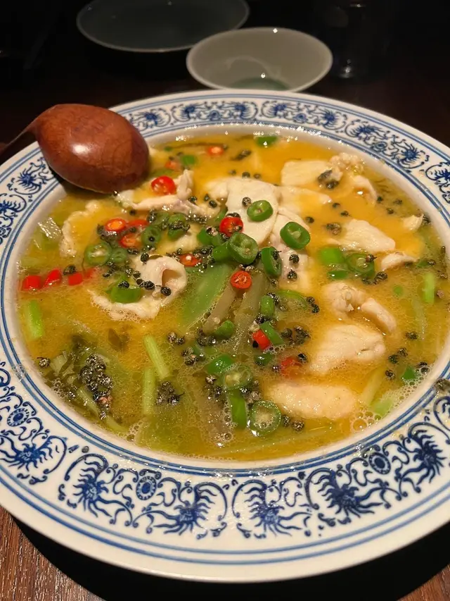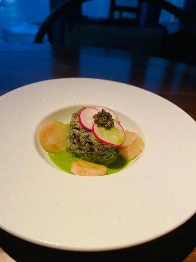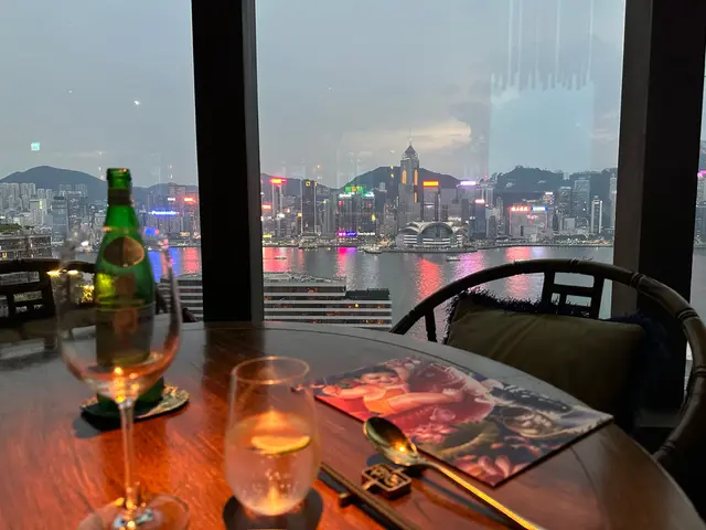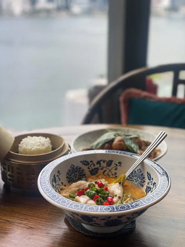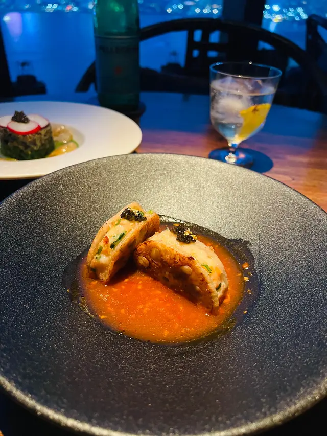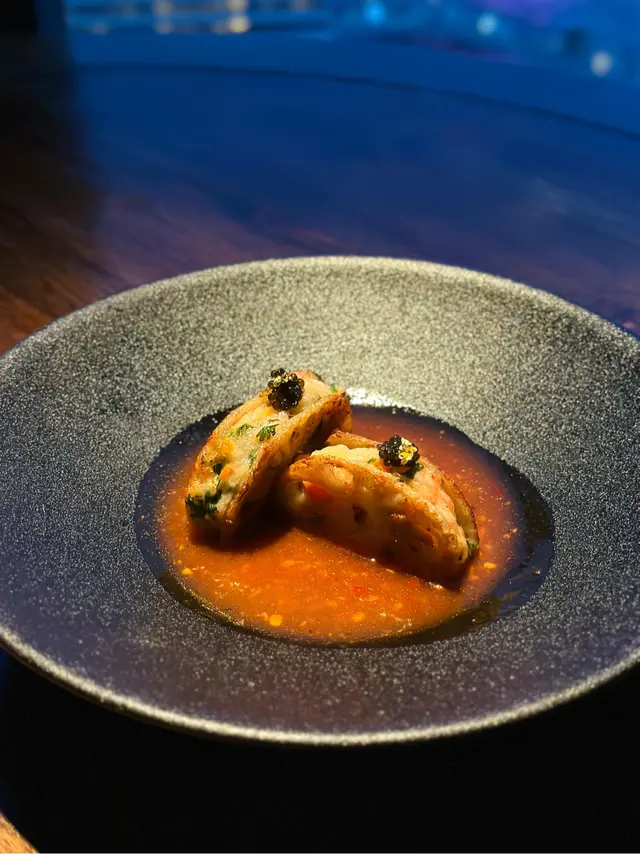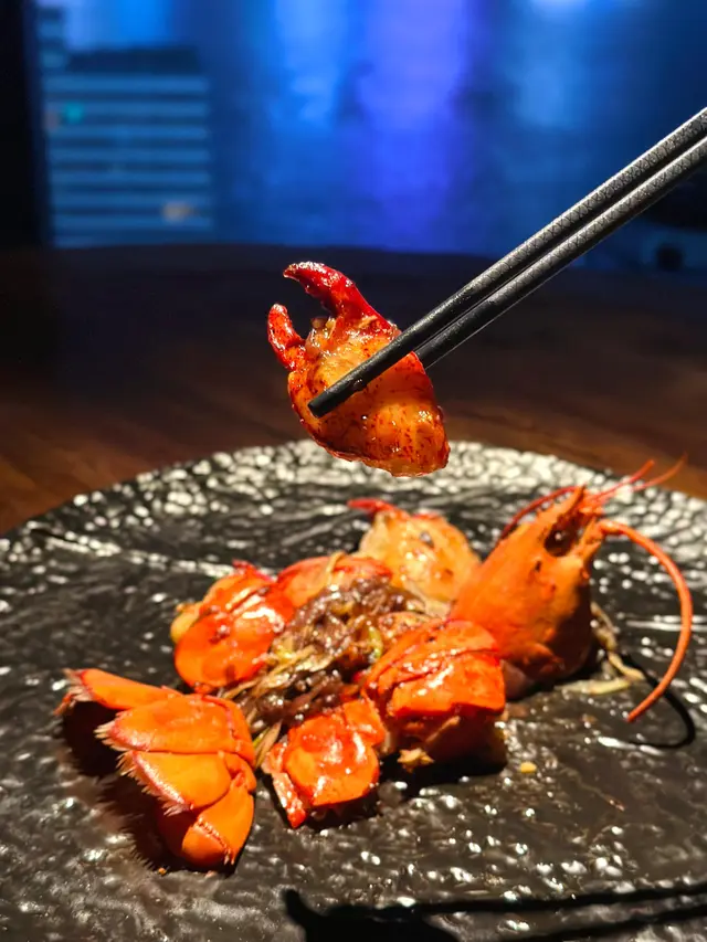 一走出電梯門,我穿越了?四周燈光昏暗。古式古風的磚牆,古代大戶人家的的燈籠,轉眼間來到了老北京。心情雀躍的在大門附近的裝飾牆打了卡。店員引領,穿過一連串的藍色時光走廊,又回來了熟悉的維多利亞港兩岸。看著美麗的維港海景用餐,美景美食相伴,實屬一大享受。點了套餐,店員陸續上菜,服務殷勤有禮。2道前菜很是開胃。擂椒皮蛋的組合對我來說很新鮮,但味道非常的搭配,有點辣,但很好吃!另一道魚香海鮮蓮藕餅調味也很讚,蓮藕口感清爽。三蔥爆炒龍蝦,炒得很香,龍蝦肉彈牙。重頭戲是席前即燒的火焰胡椒片皮鴨,火焰的演出讓人很是驚喜。鴨皮燒過後口感特別香脆,油香味重,味道濃郁,份量還超級大! 可以4個人分享也夠。其後有小魚菜苗,魚湯味鮮,蔬菜苗也很新鮮嫩,清清淡淡的很合時。緊接著是主食:北海道帶子蔥油拌麵。蔥油香味突出,拌麵口感Q彈,而且很掛汁。醬汁感覺愈吃愈辣,但很過癮!最後是超級美的甜點,牡丹花海,美的讓人不忍吃下呀。我們穿梭古今,過了一個開心的夜晚。…查看更多