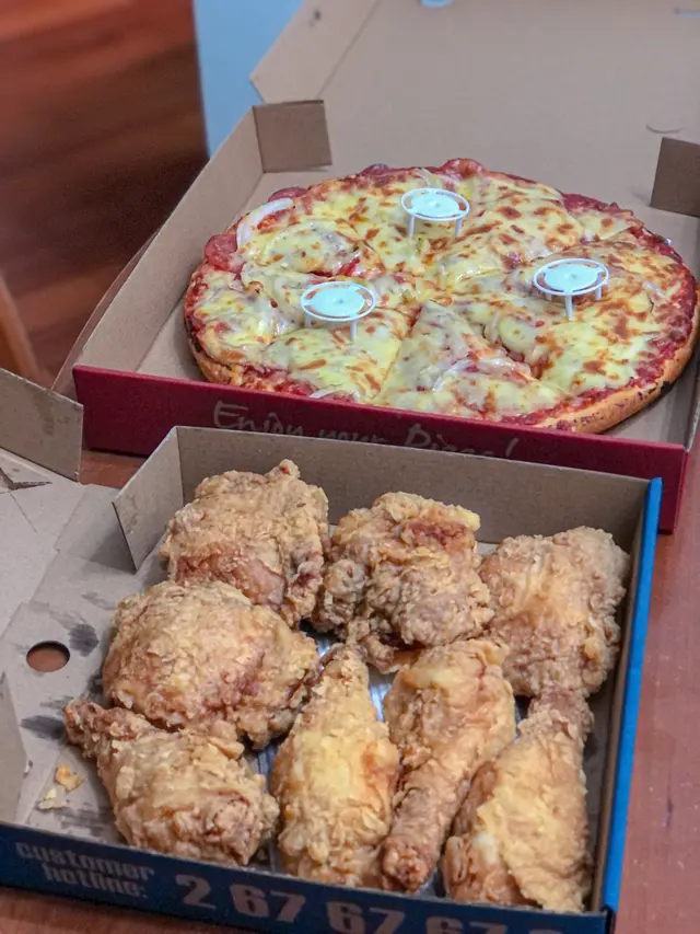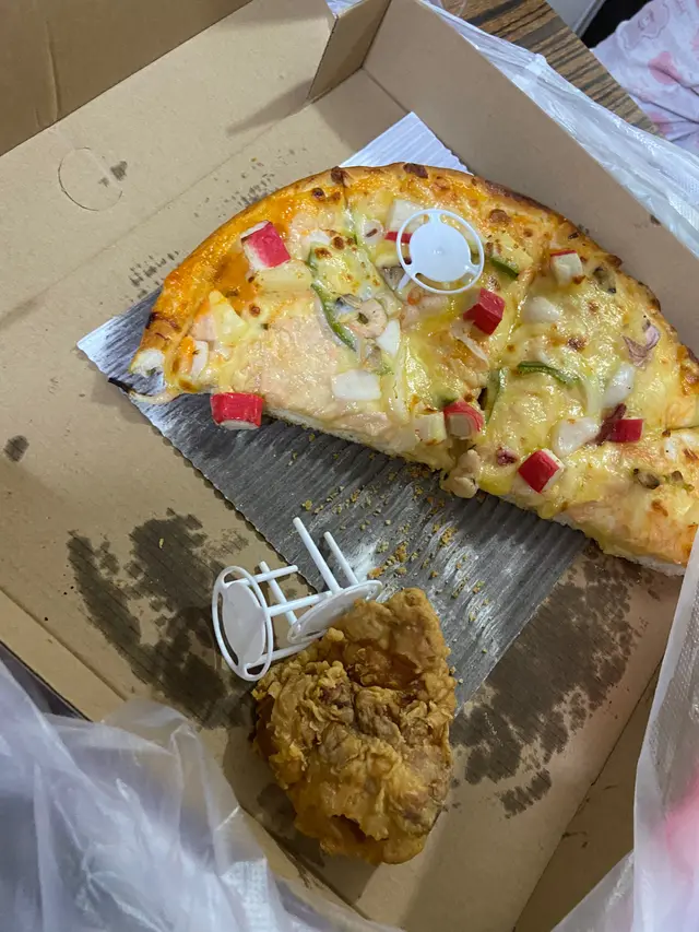 中學的時候很愛這家!充滿回憶的一家店!現在分店越來越少了!他們的套餐超級划算 人均100都不用!最愛他們的墨西哥辣肉醬焗飯真的挺辣 小時候不能吃辣但就是愛吃 每次吃到辣椒都快流眼淚 不要小看那個雞翅!那是檸檬蜜糖烤雞翅!酸酸甜甜超級好吃!披薩也選了墨西哥辣肉醬哈哈我實在太愛了 香得迷糊還有蟹柳湯!叫一個餐就送到家門口沒有配送費!p.s.他們的炸雞很好吃的雖然今次沒有叫他們的優點就是飽肚 便宜 跟外賣準時…查看更多