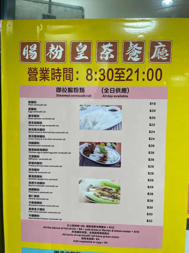 腸粉皇茶餐廳 (上环) 网址: https://s.openrice.com/QrLS0zmw6W0 地址: 香港上環蘇杭街123號地舖 电话: +852 67651189