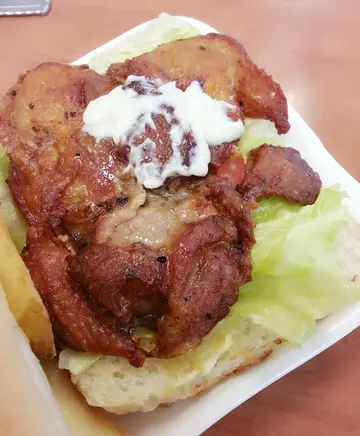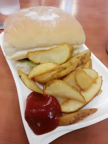 鸡扒包拼薯角$28,小妹并不太好薯角,因为太淋身不好吃,不过只有这个选择,可以加钱改转沙律,但小妹又觉得不抵吃,所以都要回了薯角,蕃茄汁店员帮你加在碟边。炸鸡扒连带鸡皮炸得香脆可口,面头抹上少许沙律酱,底下垫付生菜。自家制面包整块四四方方,面上洒上面粉,富有面包香气,咬落松软。