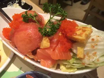 今日突然好想食乌冬 呢间开咗咁耐真系第一次系到食 呢间好特别系自家同板长联营 第二间系咪咁就唔知 但胜在可以order下啲寿司唔驶咁dry啦 我哋每人叫了个乌冬 但份量并不多 吃了亦不会觉得饱 上面系吉列猪扒咖哩汤乌冬 咖哩味好淡 而猪扒亦炸太耐好硬身 下面系海鲜蕃茄汤乌冬 蕃茄味亦不久 青口有点苦 而乌冬质感亦不久弹性爽口 整体乌冬水平普通一般除了乌冬 亦叫了几款寿司分别有亲子丼(三文鱼厚身 几鲜甜) 火灸三文鱼 火炙酱油三文鱼(第一次食挺好味的 可以一试) 香芒软壳蟹卷(香芒好酸 无咗香芒仲好食 但无意思了)另外仲叫了个海鲜沙律 蟹子颇多 落足料 系个不错既开胃菜!!!