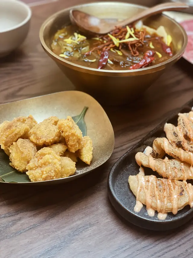 Checkin-taipei由我中學已經mark實想食 個陣覺得好貴但依家物價已經同其他餐廳差吾多價格 但係呢間成日都翻新menu 甜品超級創新 一定要試下!🍳髒髒鹹蛋黃芋泥蛋餅💰88上次試過其他味蛋餅 呢個可以當係甜品!上面灑左鹹蛋黃碎但係內餡就冇包到 所以其實味道唔係好突出 個人覺得可以再多少少 但係芋泥一定要讚!唔係科技感嘅一pat野 係有芋頭蓉嘅一大塊 feel到加左糖 有糖水味好好食 但芋頭本味都足夠整體蛋餅存在感唔係好高 可以當甜品食 下次會想試下鹹蛋黃芋泥球!🥩沙茶牛小排粉絲煲💰188係牛肉麵同煲中間揀左後者 沙茶鍋好特別有個漏斗 店員會特別講解每邊3分鐘 煮到一半就要落牛肉 牛肉都幾肥美 不過味道較淡粉絲煲入面主要都係粉絲 菌子同金菇 個人覺得可以加多小小其他配料 同埋粗小小嘅粉絲會更好食~沙茶湯味都幾濃郁🍜鹽水雞涼皮💰128聯乘兩姐妹粉皮有限公司嘅雞絲粉皮有炸豌豆同辣椒油跟 可以自由選擇要唔要加埋一齊撈 夏天來返呢碗真係超級解暑!有好多蔬菜特別係綠色嘅水蓮好有咬口 清爽又多汁!麻醬味道濃郁 唔會太結都冇話特別稀 粉皮斷口型極高 同平時食有咬口嘅唔同 都幾好食🍮鐵觀音法式燉蛋💰88最後係鳳梨酥麻糬蛋塔同呢個中間揀左cream brûlée!鐵觀音嘅融入令呢個甜品冇咁漏 但焦糖面勁有誠意 份量足鋪滿成個表面 而厚度滿足得來唔會敲唔到 整體口感都好順滑!店內環境都好靚 不過來過兩次都冇book台所以座位唔算特別靚 下次來會記得!而且店員態度都好好~…查看更多