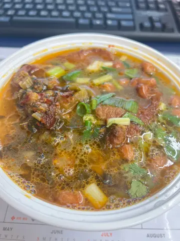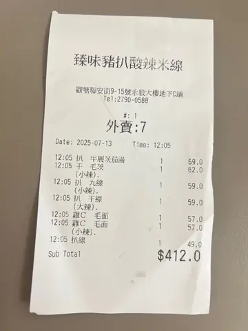 今天和同事一起点外卖,所以就近点了这家,本人叫了秘制猪扒加猪膶大酸辣米线,因为前排食中辣感觉唔够辣。相隔半小时有多,好在米线在食时,不会太淋。这碗酸辣米线算得上合格——秘制猪扒厚度适中,煎得金黄微焦,肉质不柴,而且好软熟,腌料味道刚刚好;猪膶处理得干净,口感嫩滑但少了点鲜味冲击。汤底酸辣平衡,大辣仍然不够辣,酸菜提供基本风味,虽不惊艳但顺口,加上有香脆花生,口感还是不错的。米线吸汤能力普通,胜在分量实在。整体像街坊食堂的稳阵之作,适合不想冒险时填饱肚子,若加一勺辣椒油或许更能提味。