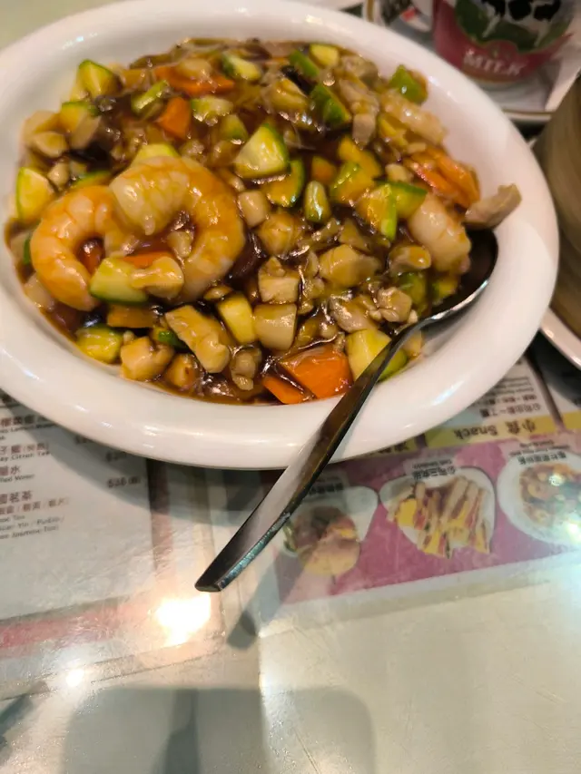 点了一份蜜汁叉烧饭85元,腊味炒芥兰108块,杨枝甘露42块,白饭18块,然后晚市还要加10%服务费。叉烧饭还可以,但是芥兰特别让人失望。因为以前来香港吃的所有芥兰都是嫩嫩的小芥兰,这家店是用的大颗的,我二十多岁的人都完全咬不烂,剩了一堆菜渣过于恶心就不上图片了,;腊味有腊肠腊肉一共三种,但是每种都特别油特别油,难以下咽的那种油。杨枝甘露一秒上菜,味道有点奇怪,没有喝过这种味道的杨枝甘露,不知道是不是我的问题。服务还可以,但是性价比太低了。…查看更多