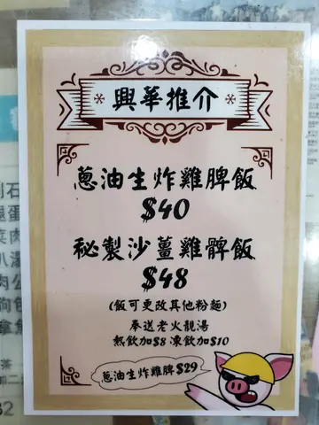 兴华茶餐厅 在兴华邨的最后一日。作为柴湾老街坊,地点似唔就脚,其实在裕兴楼(巴士站)坐架lift 上17楼行过去好近。因成日上山落山会经过,大潭水塘跑步返柴湾,在「猛鬼桥」(峰华邨) 落嚟有咩近得过呢间食肆? 返落柴湾站,除了耀东猪扒大王(又执埋),水准同佢拍得住只有「乐翠茶餐厅」(一样唔就脚及选择少。),泽记只系大份,但食物水准系唔入流。「葱油鸡脾」系兴华嘅名物,但其实我咁多次都冇食过,我次次都系炒嘢,师傅炒功一流,但今日系最后一日,等都要等葱油鸡脾试试,因唔知仲有冇机会再食。店主话结业原因系妈妈做了几十年,厨房师傅又年纪大想退休,但其实新一代店主及佢班后生拍档朋友,个个有心有力,上年我至帮趁过两次佢地啲巨型大闸蟹,几OK㖞 (见图),新一代搅饮食有呢份心,在香港已见少卖少了。…查看更多