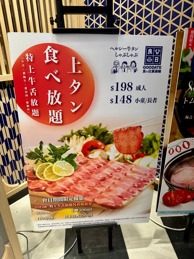 今晚去咗鑽石山荷里活廣場嘅GOODATE 良い日涮涮鍋 嘆特上牛舌放題,啱晒我呢個牛舌控~湯底係一人一鍋,可以揀自己心頭好。我揀咗生薑雞湯,味道適中啱啱好,唔會搶走肉味。自助區嘅火鍋配料選擇又多又新鮮,我哋就食多啲菜同粟米,營養均衡減低膩感。一大盤特上牛舌用木架上,排列整齊,好有視覺享受~牛舌切得夠薄,淥一淥陣變色就得!咬落爽口彈牙,加少少檸檬汁味道清爽,食落完全唔覺得膩,仲越食越開胃添~除咗穀飼牛仲有豬肩肉、雞腿肉選擇,推介雞肉,肉質彈牙又嫩滑~配雞湯好正~最後就食個雪糕降溫~爽!由而家到30/11仲有會員尊享優惠。都真係幾吸引,一大班朋友又食又飲就啱晒~😎查看更多