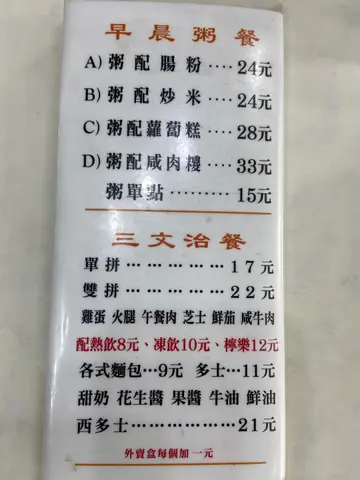 在深井住了多年, 无意中与干洗店的老板娘倾开才知道深井有间有粥卖的铺头,而且卫生企理.我于是在某个星期六早上去买早餐. 铺头不算大,大概有10张4人方型台. 粥品只有一款,但每天会转款, 我试过皮蛋瘦肉粥,南瓜粥,瑶柱白果粥,菜干猪骨粥…;随了粥品,还有肠粉,炒面/米粉,煎萝卜糕,咸肉粽,三文治,而主打是车仔面.我本人不太喜欢食车仔面,只试过很少款式; 粥的味道比较清淡,接近住家煮的.最近端午节前买了一只红豆碱水粽(因其他款式已沽清), 碱水味适中, 豆沙够味但不甜,真的好味道!明年要早一点去买, 试试不同款式.食店主要由一位老太太打理,大部份食客都是街坊,会与老太太打招呼和闲谈,现今大部份食店很难见得到. 由于是街坊小店,速度不能与一般快餐店,茶餐厅相比,也许你在这里应该慢慢地享受你的早餐,这是在平日上班的日子不能做到的.