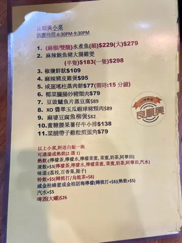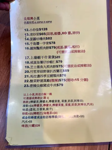 麻雀虽小五脏俱全的良顺兴位于大角咀、良心小店、出品稳定葱油乳鸽胡椒沙白椒盐九肚鱼拼鲜鱿姜葱枝竹蚝煲蒜子焗东升斑樱花虾蒸虾煎肉饼晚饭小菜必须预订、旁边厕所有如生化寿尸商场、电影感十足、老板娘除咗招呼周到,温文尔雅仪态万千之外还要10分亲民、又免开瓶费海鲜占整个菜单的大部份,一人$300有新鲜游水东升、有虾有蚝、食物质素绝对对得起价钱有找、加上人情味、开开心心聚餐也