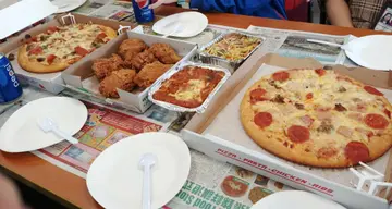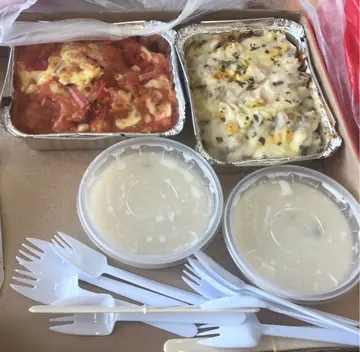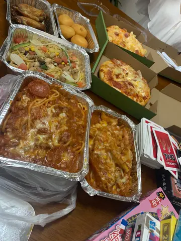 今次去朋友屋企玩 一共五个人叫咗呢堆外卖大约$400几推介嘅系芝士年糕波食落虽然无年糕口感但系入口即溶丶外脆内软嘅芝士都好正然后Pizza嘅质素都系中规中矩唔太推介嘅系意粉肉医意粉嘅意粉煮得太耐丶有点儿软身另外一个意粉唔够咸但总括而言$400喂饱五个人性价比都几高抵赞嘅系20分钟外卖送到非常有效率