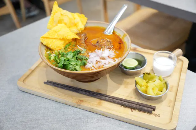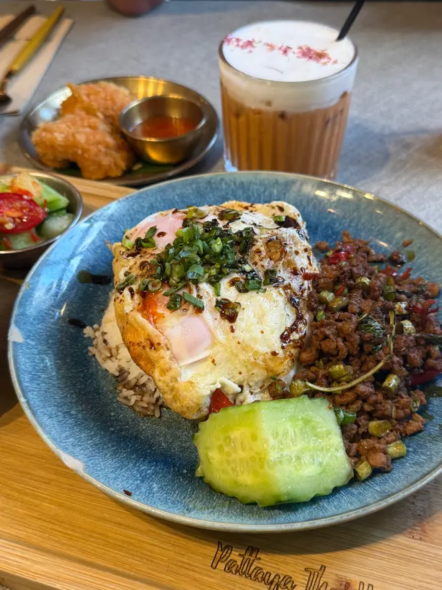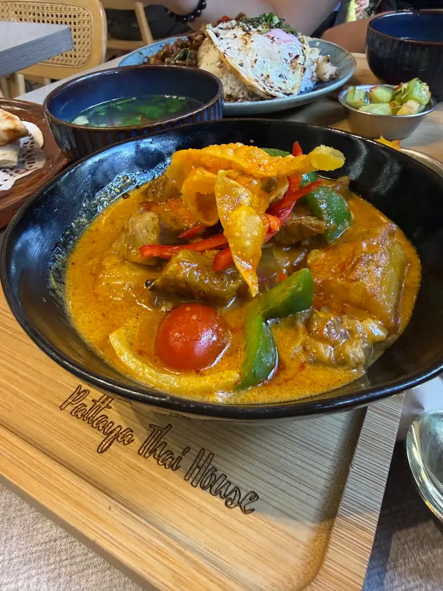 芭堤雅泰國餐館 元朗必食泰國菜性價比高又好味!環境舒服😌員工服務親切💞好推介大家來食店內裝修花上心思配搭植物同木系設計令人感覺好舒服假日來到食Lunch ! 全場爆滿人氣火旺,想食記得早點來菜品款式多:有泰式粉麵、船麵、炒飯、咖哩等等套餐仲跟餐湯、前菜辣酸菠蘿青瓜🥒好醒胃更可優惠價加配多款特色飲品同小食招牌肉碎飯肉碎微辣配埋即煎流心蛋,惹味又香口黃咖哩牛筋腩配薄餅咖喱味道濃郁,牛筋腩入味帶椰香鬆脆炸五花腩即叫即炸,皮脆咸香配上兩款秘製醬汁更添口感炸蝦餅外皮金黃香脆蝦肉口感彈牙泰式香蕉煎餅加椰子雪糕 🍦加入榛子醬、香蕉同椰子雪糕配上即煎酥脆薄餅!冷熱雙重口感!泰式奶茶茶味濃香又夠順滑!蜂蜜香茅茶味道清香宜人微甜!查看更多