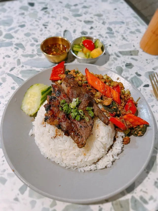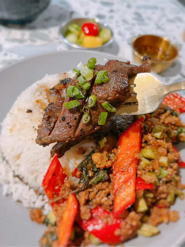 今次來到元朗呢間開業多年嘅人氣泰國菜!仲未夠鐘開門,已經見到店外人頭湧湧,開始排隊等開門啦!好彩餐廳設有上下兩層,即使排長龍亦好快入到座!店內裝修以簡約嘅小清新風為主,環境舒適~✨招牌香葉炒肉碎飯配USDA頂級燒牛肉燒牛肉軟嫩多汁!香葉炒肉碎濃郁惹味,令人忍唔住食晒成個飯~✨碎肉生菜包爽脆嘅生菜包住酸辣嘅肉碎,味道清新又開胃~✨炭燒豬頸肉豬頸肉份量十足!爽口彈牙,每一啖都散發住經炭燒過嘅淡淡焦香~✨香芒糯米飯香甜嘅芒果配搭濃郁嘅椰漿同埋軟糯嘅糯米飯,味道相得益彰~✨芭堤雅泰奶雪山賣相打卡一流!用泰奶整出來嘅雪花冰,質地輕盈,入口即化!再配搭椰漿同埋Lotus餅碎碎,味道有驚喜~✨凍泰式綠奶茶第一次飲以綠茶做茶底嘅泰式奶茶,真係別有另一番風味啊~食物味道有水準,價錢亦相當親民,難怪小店一直深受街坊歡迎👏🏻下次一定會再訪~查看更多