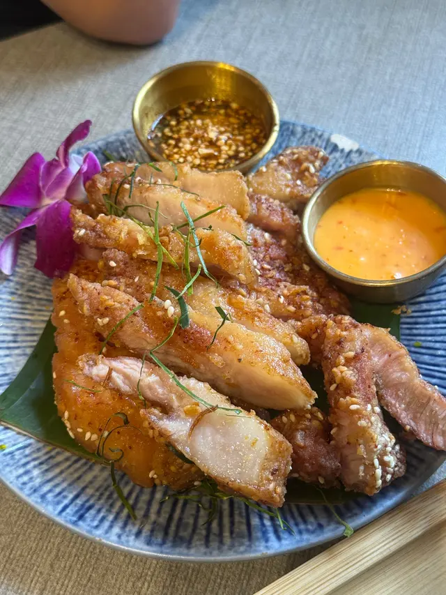 嚟元朗食飯嘅話呢一間一定係我嘅首選。我哋叫咗一個泰式拼盤入邊有蝦餅,魚餅炸雞翼同埋炸春卷。貪心嘅人叫呢一個拼盤就好心滿意足。蝦餅嘅蝦肉超級爽口彈牙,魚餅好香香茅味,炸雞翼同炸蔥卷雖然係大路菜式,但係好香口一定好食。燒豬頸肉係呢一餐飯嘅MVP,非常之Juicy,香香甜甜,肥妹仔係未食過咁好食嘅燒豬頸肉。肥妹仔叫咗一個泰式蝦醬肉碎炒飯,蝦醬味超香濃,一啲都唔腥,豉油味同蝦醬味嘅比例剛剛好,仲有一個非常好食嘅配菜就係泰國臘腸,超級好食。甜品方便我哋叫咗個奶茶雪山,泰式奶茶嘅味好香濃。查看更多