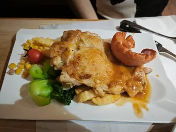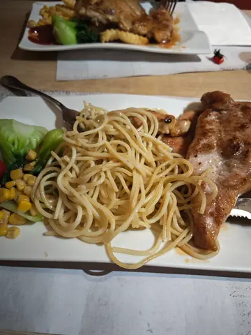 好耐无去花园, 今晚过去试一下, 入去比安排坐收银附近的卡位, 都几舒服, 望下晚餐, 都有几多款, 我叫左一个谷饲猪肉眼🐽扒配意粉🍝, 要左一个忌廉汤, 转头就拿出来, 都好大碗, 忌廉汤味道唔差, 入面有d配料, 但食到有细细粒的壳😆🤐, 旧牛油食落好香, 旧餐包食落暖暖地, 但包面比较硬😅唔系太软熟, 之后送来主菜, 卖相都几靓仔, 意粉份量唔系好多, 食到有d炒过的味道, 味道唔太差, 但食落有d干, d汁好少😆, 二件猪🐽肉眼扒都好大块😋, 切落去都好软身, 食落系比其他🐽一般猪扒好食, 唔硬, 但入面的肉汁唔系太丰富, 肉味算系无乜😅😆, 侧边有粒车厘茄🍅同粟米粒🌽, 有二棵小唐菜, 佢另外有一个前菜, 系薯蓉🥔焗青口🦪, 虽然拿出来卖相一般, 但食落味道唔差, 之后叫杯冻柠茶🍋走甜少冰, 味道叫合格, 茶香味无乜🥲…查看更多