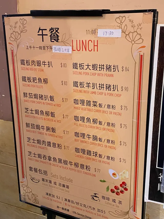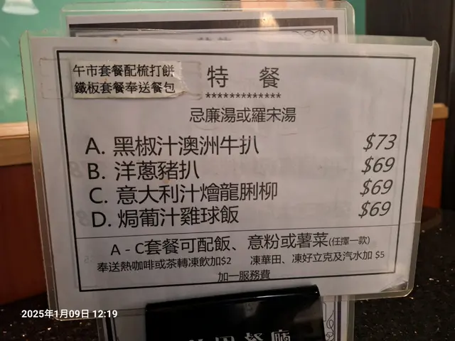 新年仲有午餐下午茶提供,套餐包餐汤餐包。重点系价钱上边只有+1冇另外的服务费。今次嗌咗个铁板肉眼,铁板够热,肉嘅份量亦够多。但系肉嘅质素就始终一般般,但以唔够$100嚟讲系一个唔错嘅选择。